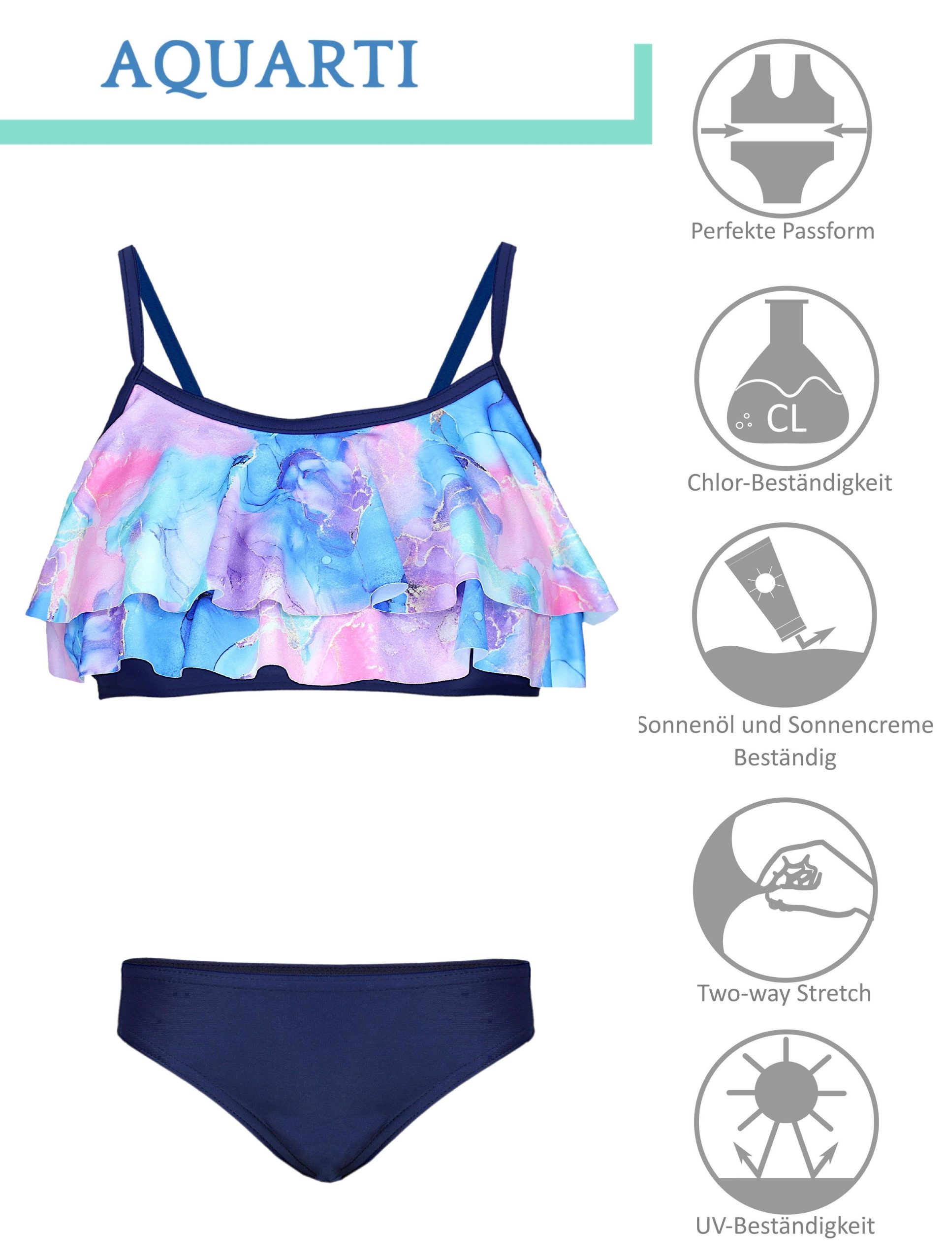 Stylish girls‘ bikini set from Aquarti featuring a mermaid or stripe design.