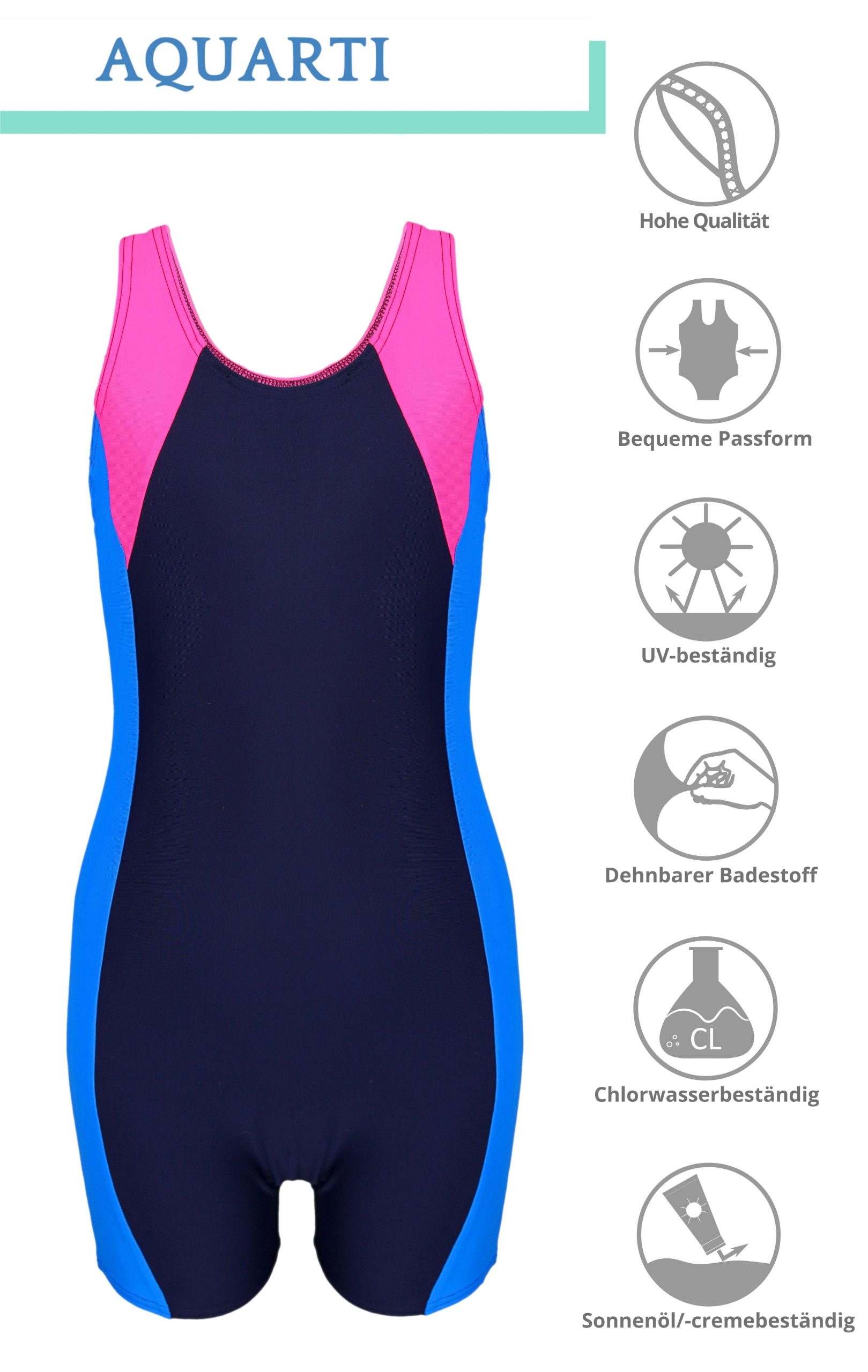 Dive into fun and style with the Aquarti Girls‘ Swimsuit! This sporty one-piece swimsuit combines comfort and performance, making it perfect for beach days, pool parties, or swim lessons. Crafted with a comfortable leg cut (hot pants style) and a racerback design, it offers unrestricted movement while providing a flattering silhouette. The swimsuit features quick-drying, chlorine-resistant fabric with excellent UV protection, ensuring your little one stays protected and comfortable. The front is fully lined for added modesty. Available in a variety of trendy color combinations and featuring high-quality craftsmanship.