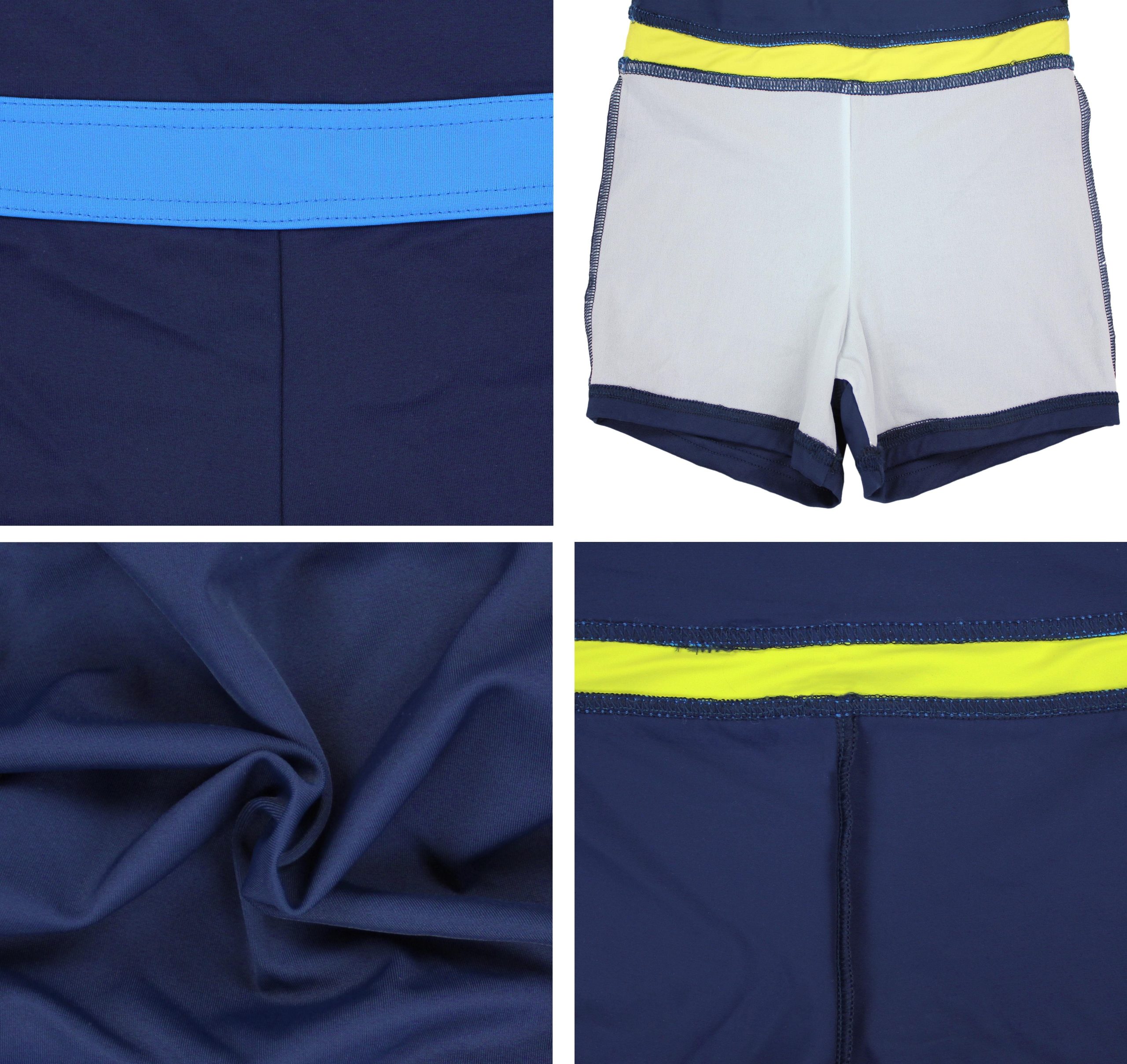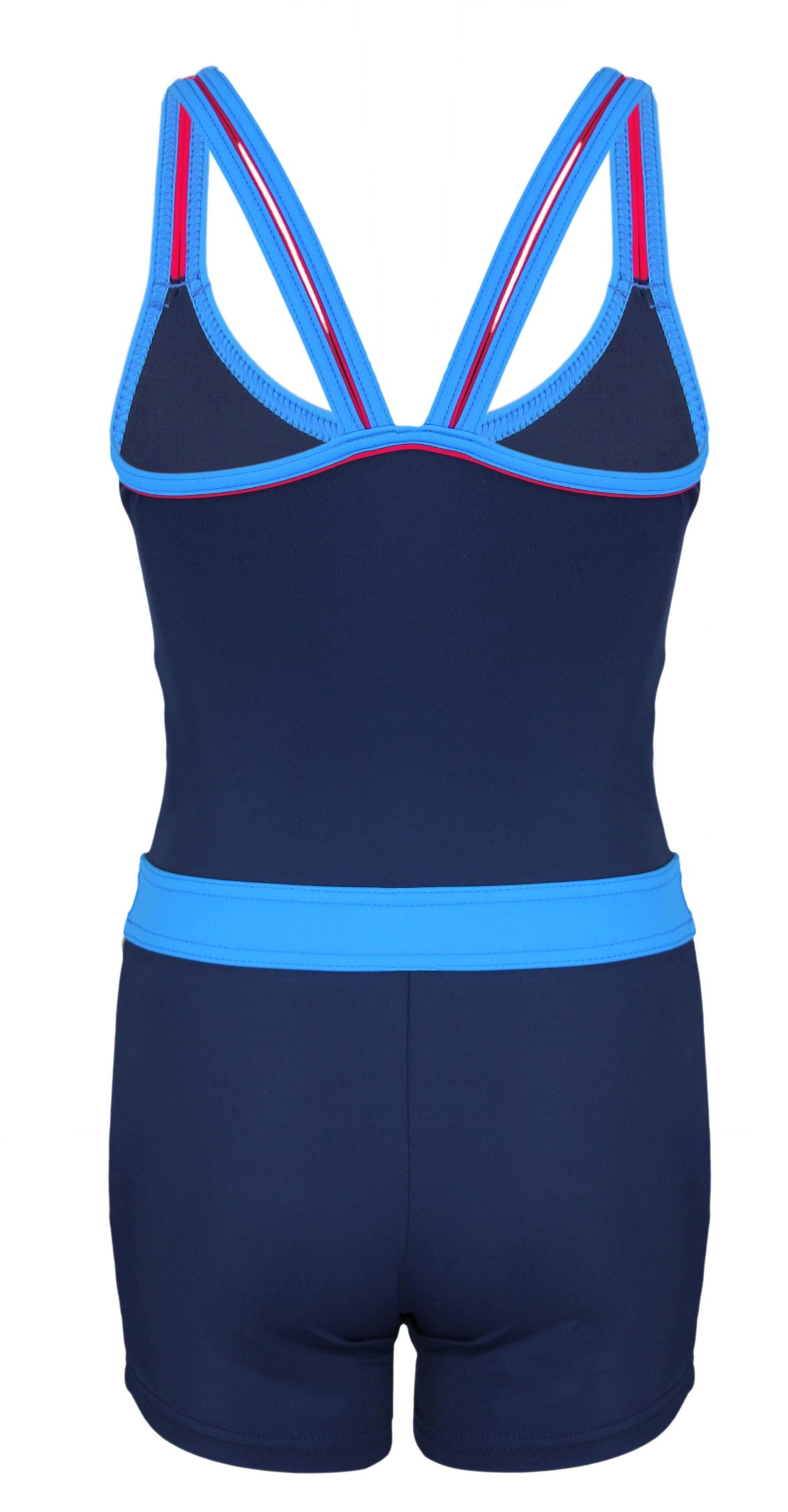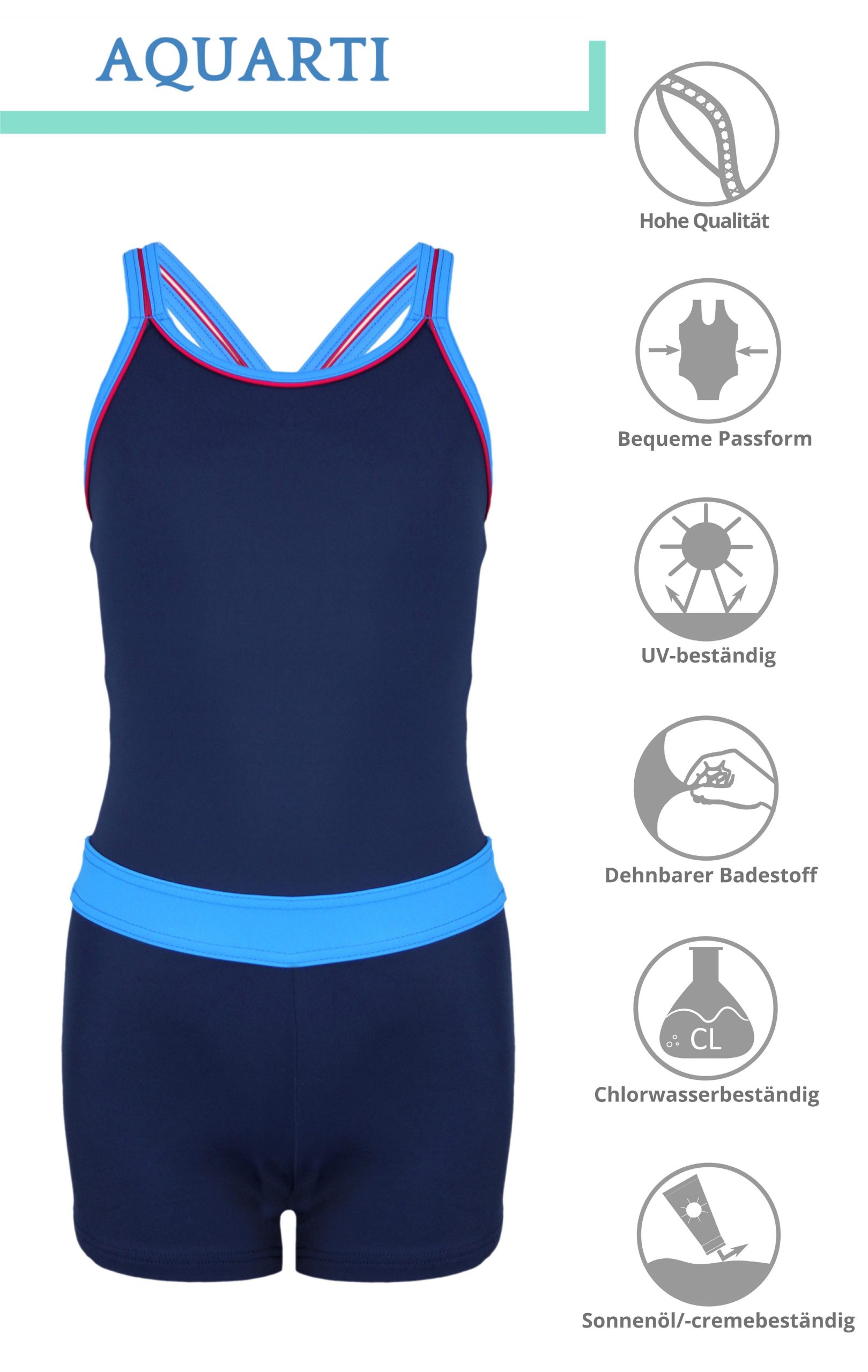 Sporty swimsuit with legs from Aquarti. Chlorine-resistant, quick-drying, elastic fabric with UV protection. Comfortable fit, flat-lock stitching. Made in the EU.