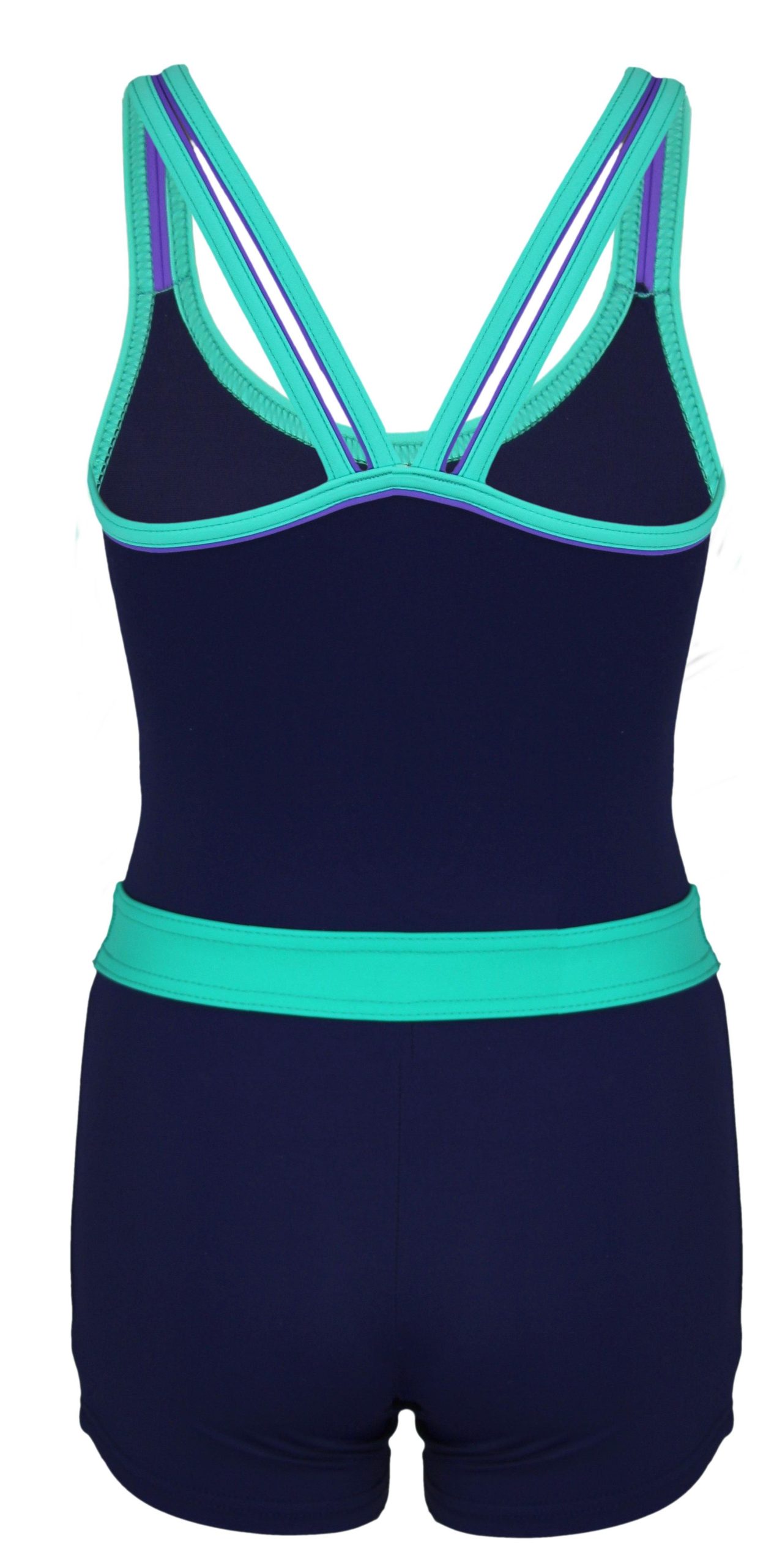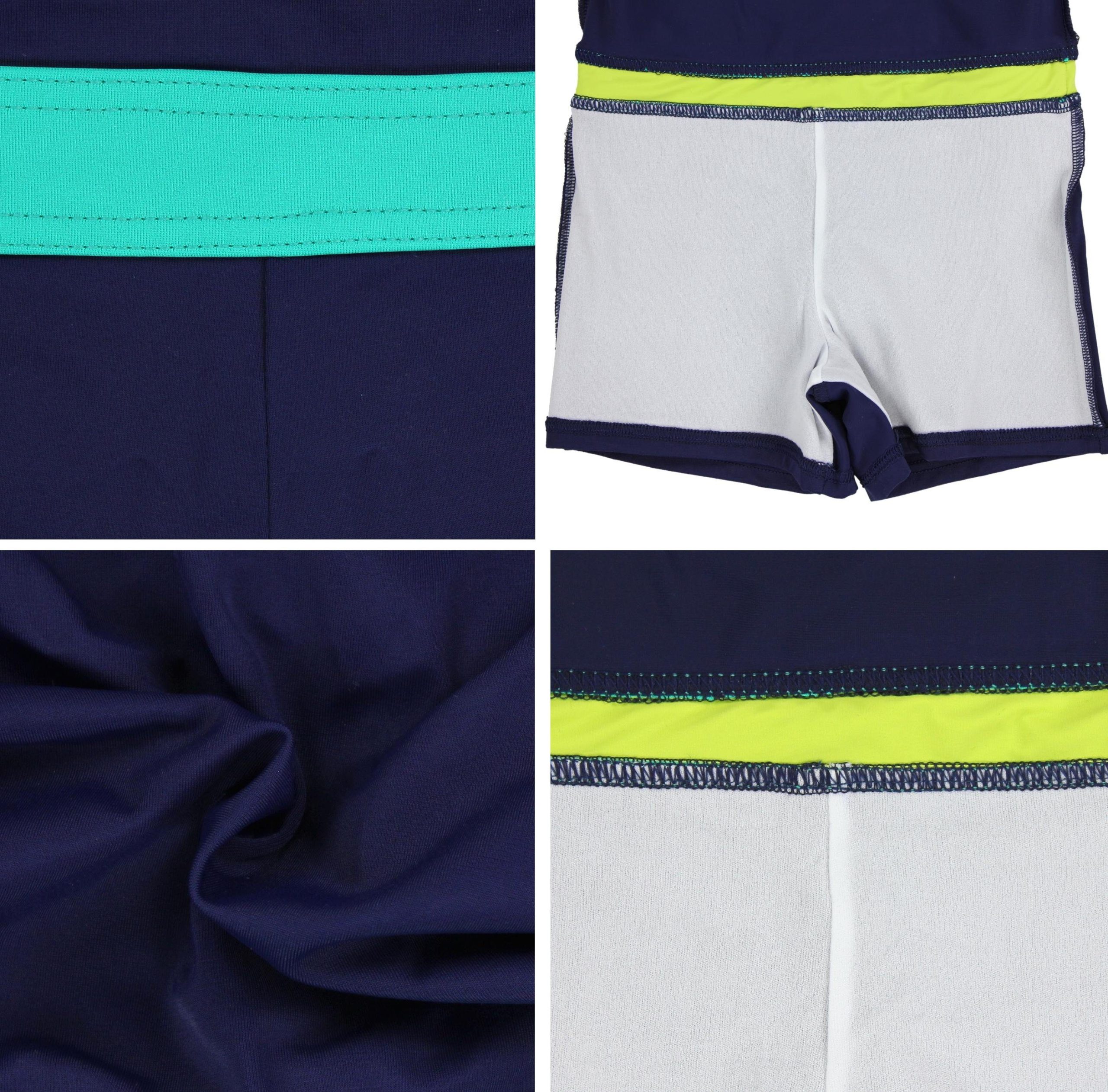 Sporty swimsuit with legs from Aquarti. Chlorine-resistant, quick-drying, elastic fabric with UV protection. Comfortable fit, flat-lock stitching. Made in the EU.
