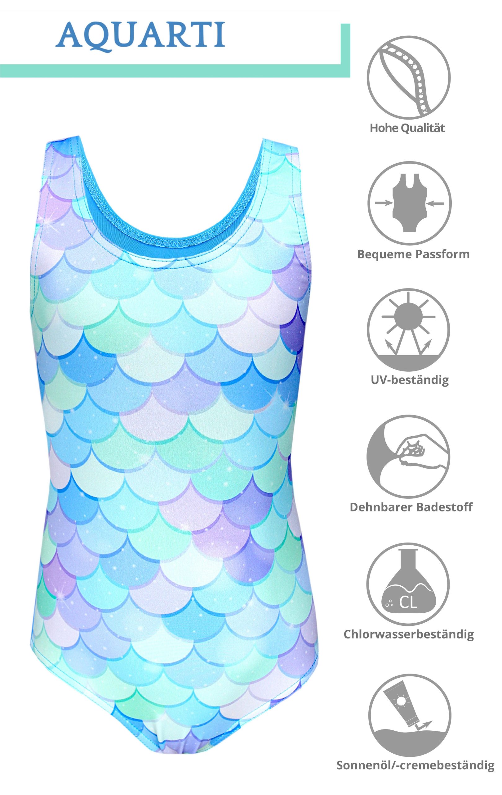 Dieser Aquarti Mädchen Sport Schwimmanzug mit Ringerrücken begeistert mit dem coolen Delfin-Print auf der Vorderseite und mit erstklassiger Verarbeitungsqualität. Dank der hochwertigen Materialmischung passt der Kinder Sportbadeanzug sich ausgezeichnet an den Körper an. Da der Badestoff schnelltrocknend, chlorbeständig und auch resistent gegen UV-Strahlen ist, eignet sich das Modell ideal für den Stranthurlaub, Schwimmbad und auch für den ersten Schwimmunterricht. Zudem sorgt die komfortable Passform für einen perfekten Sitz und eine uneingeschränkte Bewegungsfreiheit.