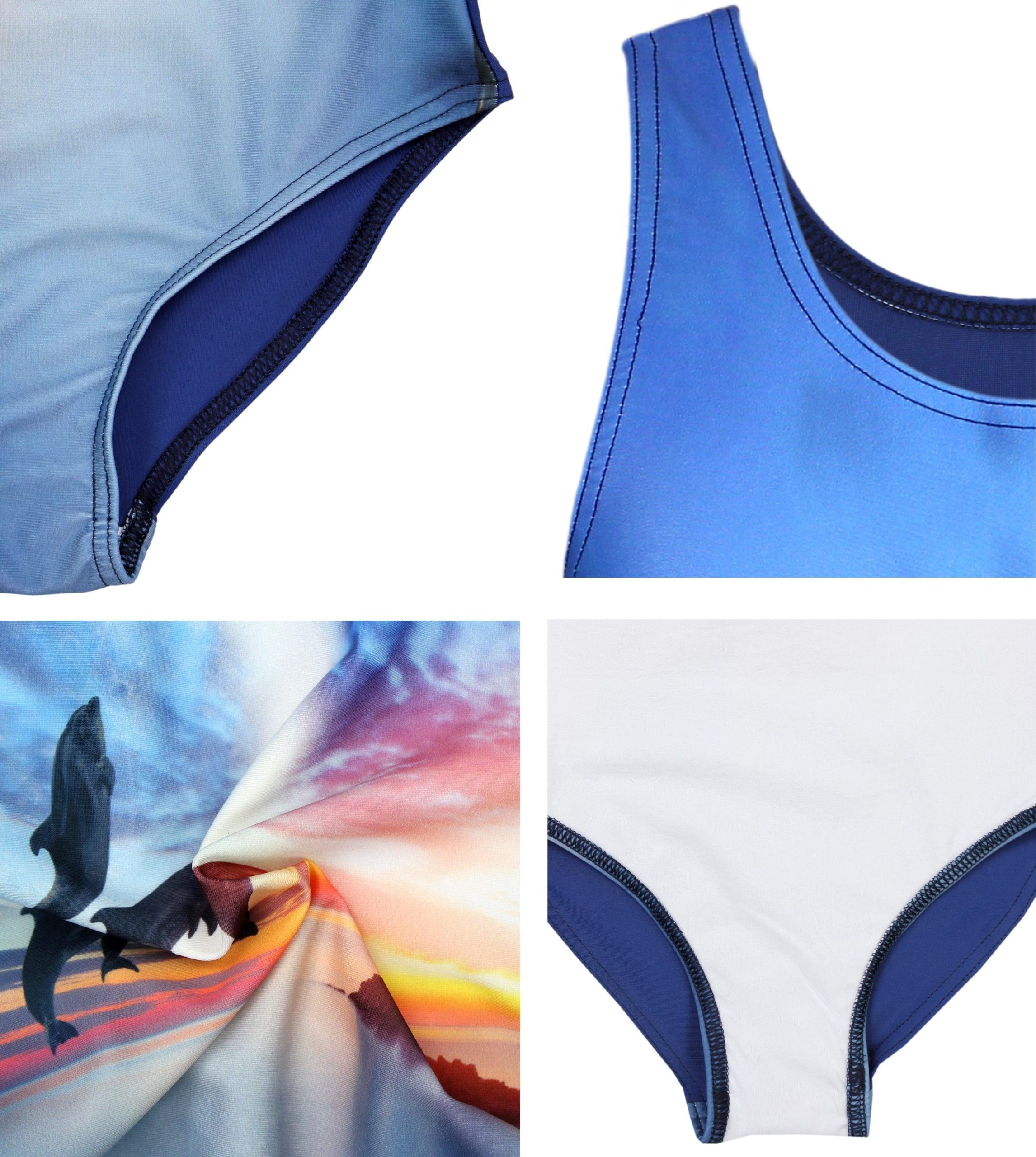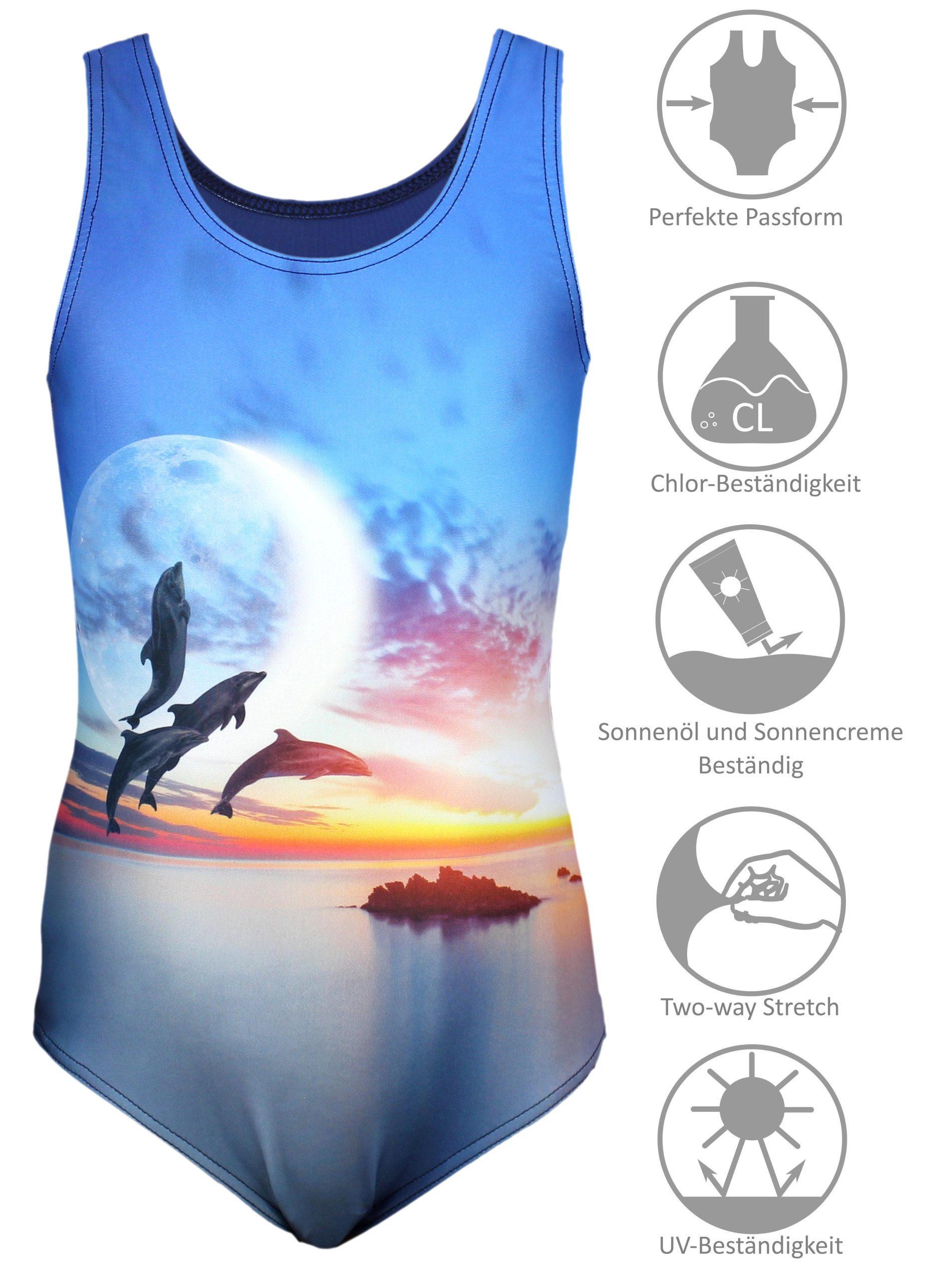- Bequemer Mädchen Schwimmanzug mit Racerback und schönem Delphin Druck vorn