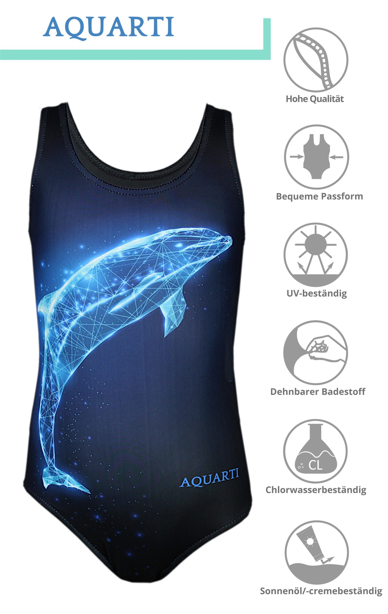 Dieser Aquarti Mädchen Sport Schwimmanzug mit Ringerrücken begeistert mit dem coolen Delfin-Print auf der Vorderseite und mit erstklassiger Verarbeitungsqualität. Dank der hochwertigen Materialmischung passt der Kinder Sportbadeanzug sich ausgezeichnet an den Körper an. Da der Badestoff schnelltrocknend, chlorbeständig und auch resistent gegen UV-Strahlen ist, eignet sich das Modell ideal für den Stranthurlaub, Schwimmbad und auch für den ersten Schwimmunterricht. Zudem sorgt die komfortable Passform für einen perfekten Sitz und eine uneingeschränkte Bewegungsfreiheit.