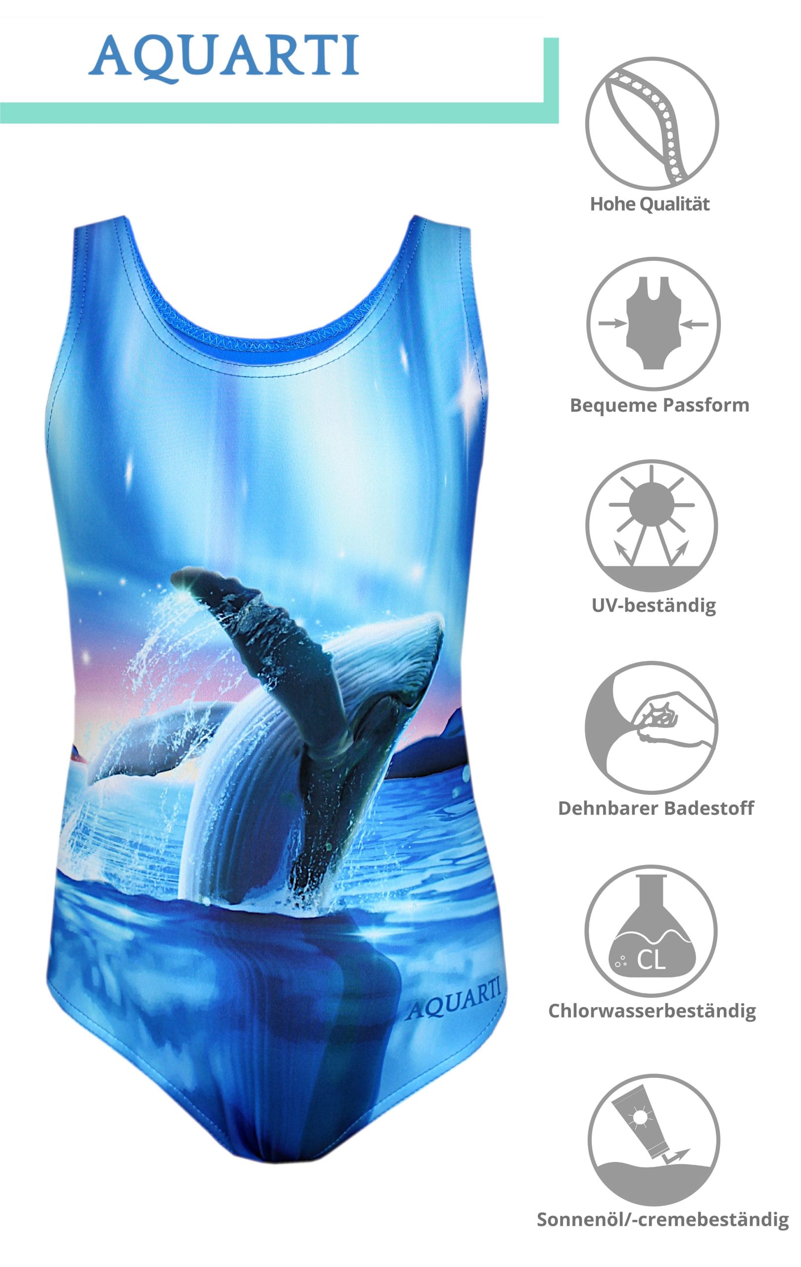 Dieser Aquarti Mädchen Sport Schwimmanzug mit Ringerrücken begeistert mit dem coolen Delfin-Print auf der Vorderseite und mit erstklassiger Verarbeitungsqualität. Dank der hochwertigen Materialmischung passt der Kinder Sportbadeanzug sich ausgezeichnet an den Körper an. Da der Badestoff schnelltrocknend, chlorbeständig und auch resistent gegen UV-Strahlen ist, eignet sich das Modell ideal für den Stranthurlaub, Schwimmbad und auch für den ersten Schwimmunterricht. Zudem sorgt die komfortable Passform für einen perfekten Sitz und eine uneingeschränkte Bewegungsfreiheit.