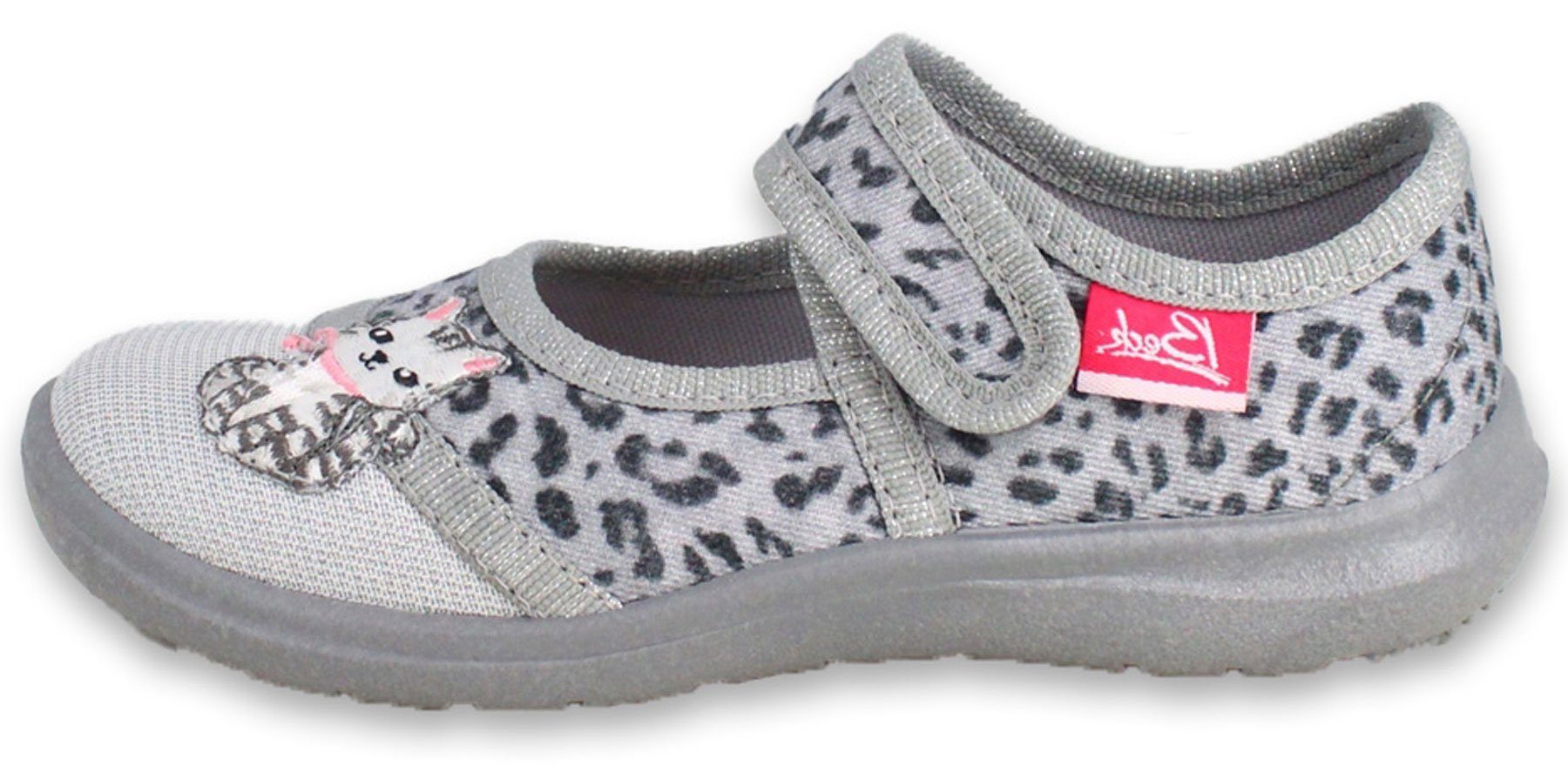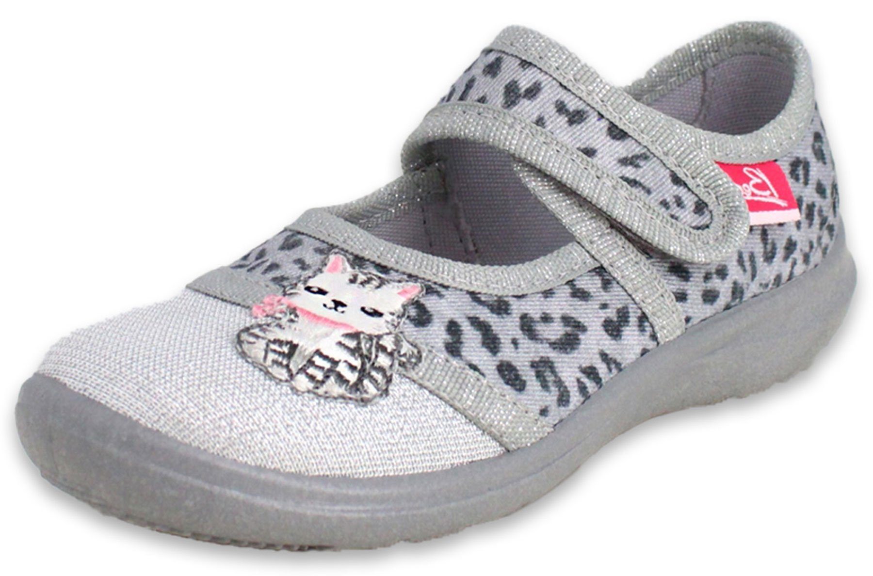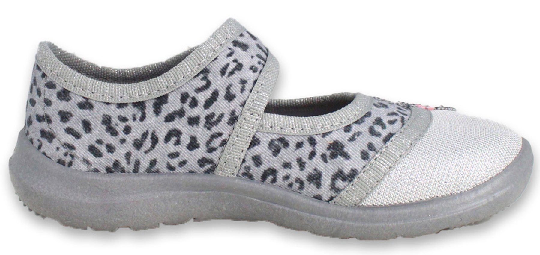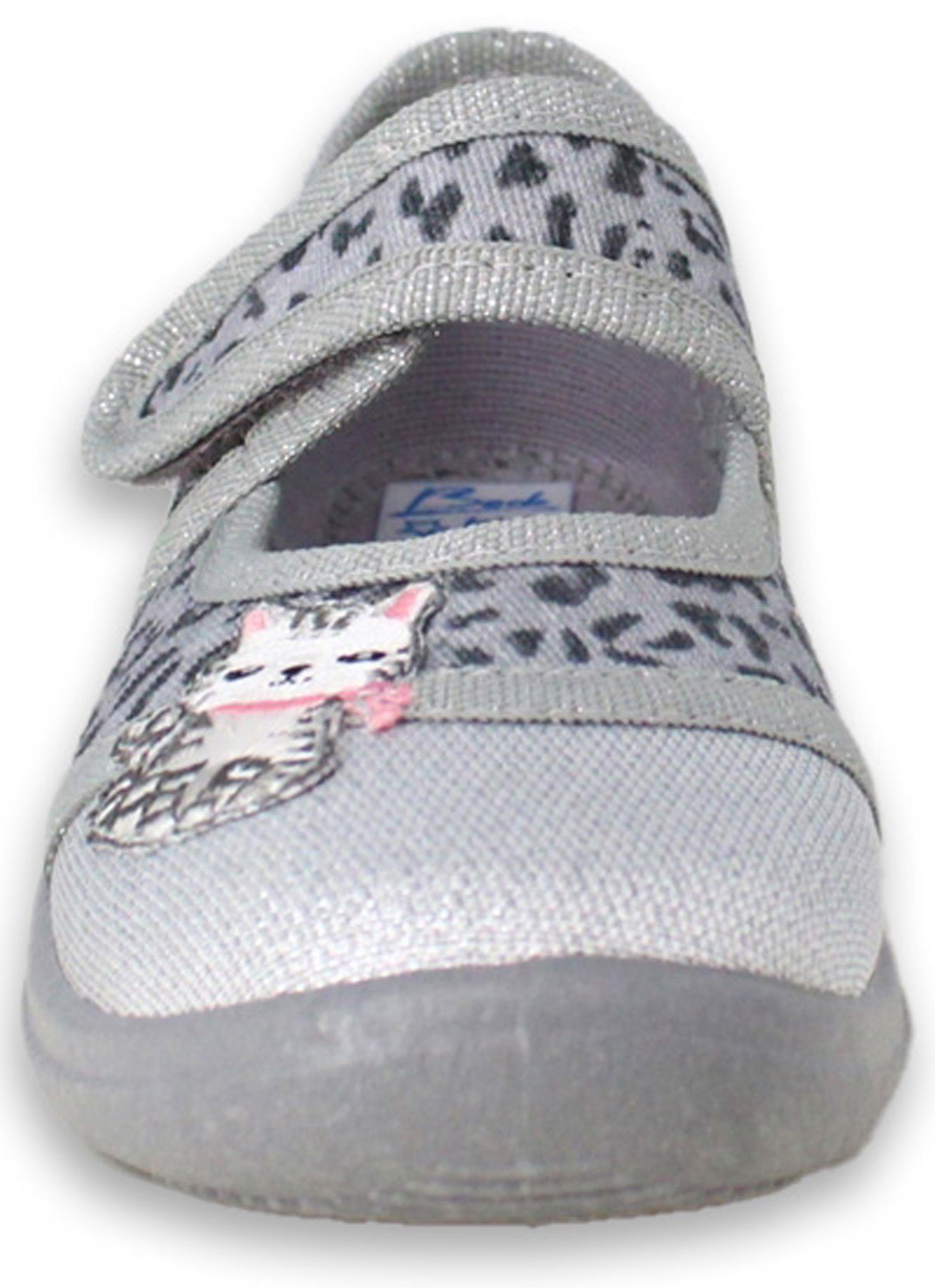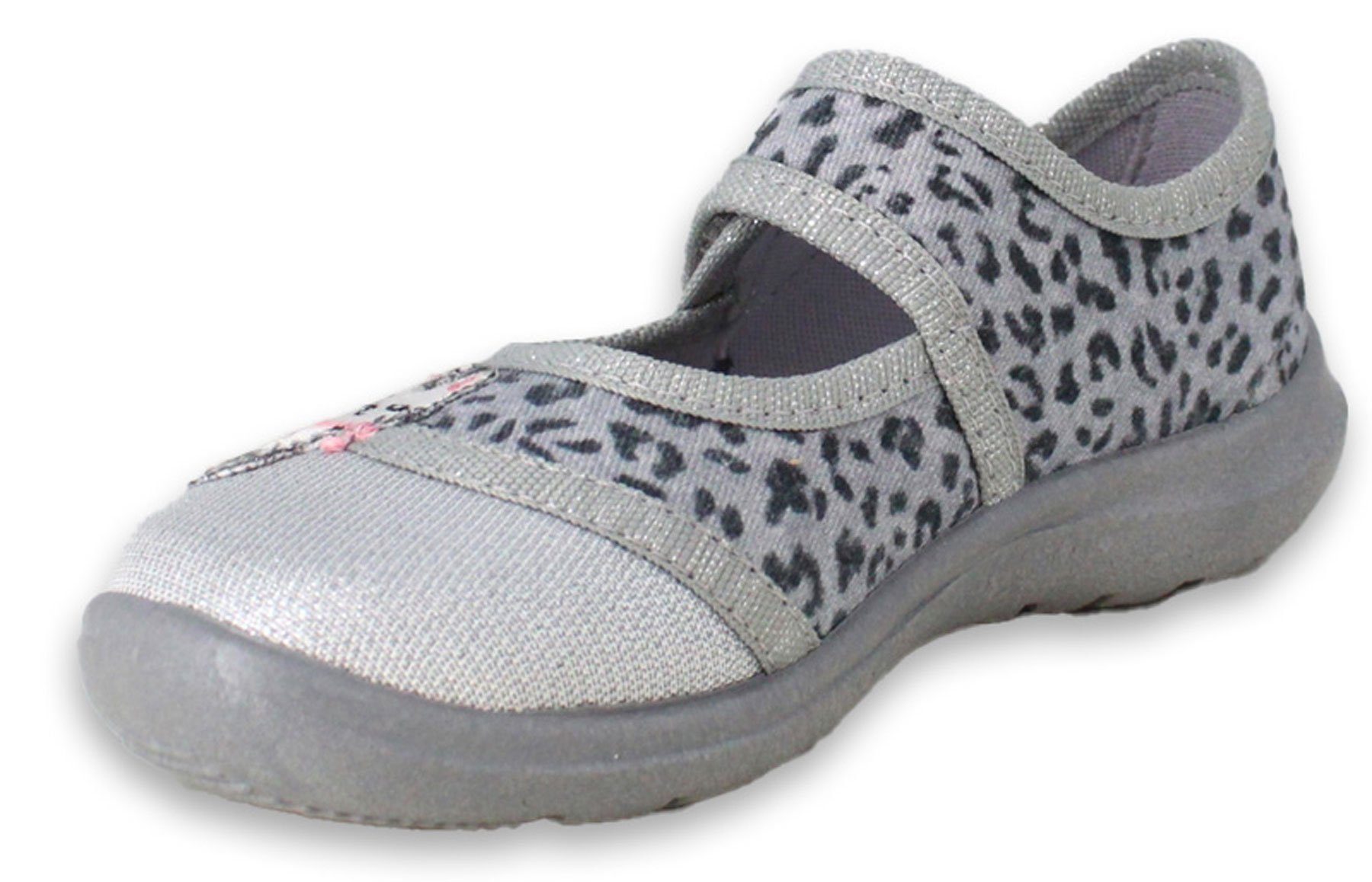 Charmingly sweet girls‘ slippers in a ballerina style. It doesn’t always have to be pink! A subtle grey colour with a leopard print and shimmering silver-coloured cap. The cute little cat design is sure to catch everyone’s eye. The wide-opening Velcro closure ensures easy entry and optimal comfort. The sole is flexible and non-marking. Ideal for kindergarten, school, and of course, at home. Particularly suitable for narrow feet.