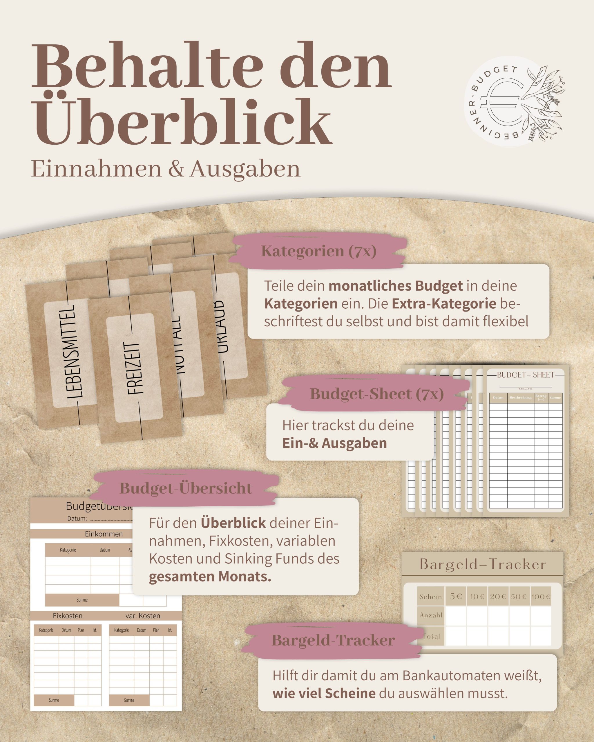 Kickstart your financial journey with the BeginnerBudget Ringbuchmappe Starter Kit! This comprehensive Budget Planner combines the traditional envelope system with engaging savings challenges to help you visualize and control your finances.