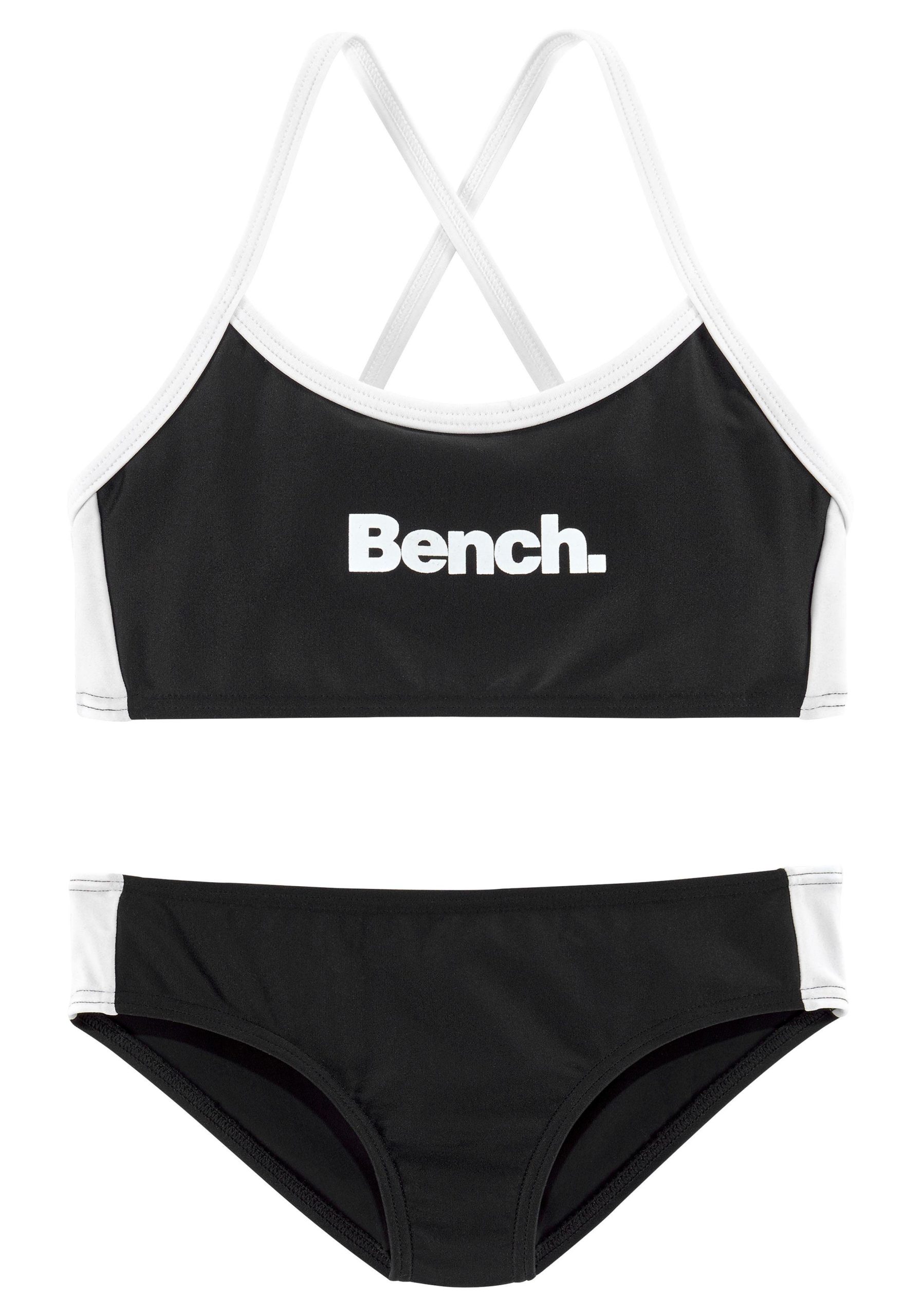 Der moderne Bustierbikini von Bench besticht durch gekreuzte und regulierbare Träger im Rücken. Des Weitenden befindet sich auf dem Bikinitop mit kontrasstreichen Trägern ein plakativer Logoprint. Das schicke Höschen kommt ganz klassisch und mit kontrastfarbenen Seitestreifen daher. Dank der tragenehmen Materialmischung sorgen Ober- und Unterteil gemeinsam für einen famosen Sitz. Der trendige Bikini begeistert nicht nur am Strand, sondern auch in der Therme. Unverzichtbar gut: der Bustierbikini von Bench!