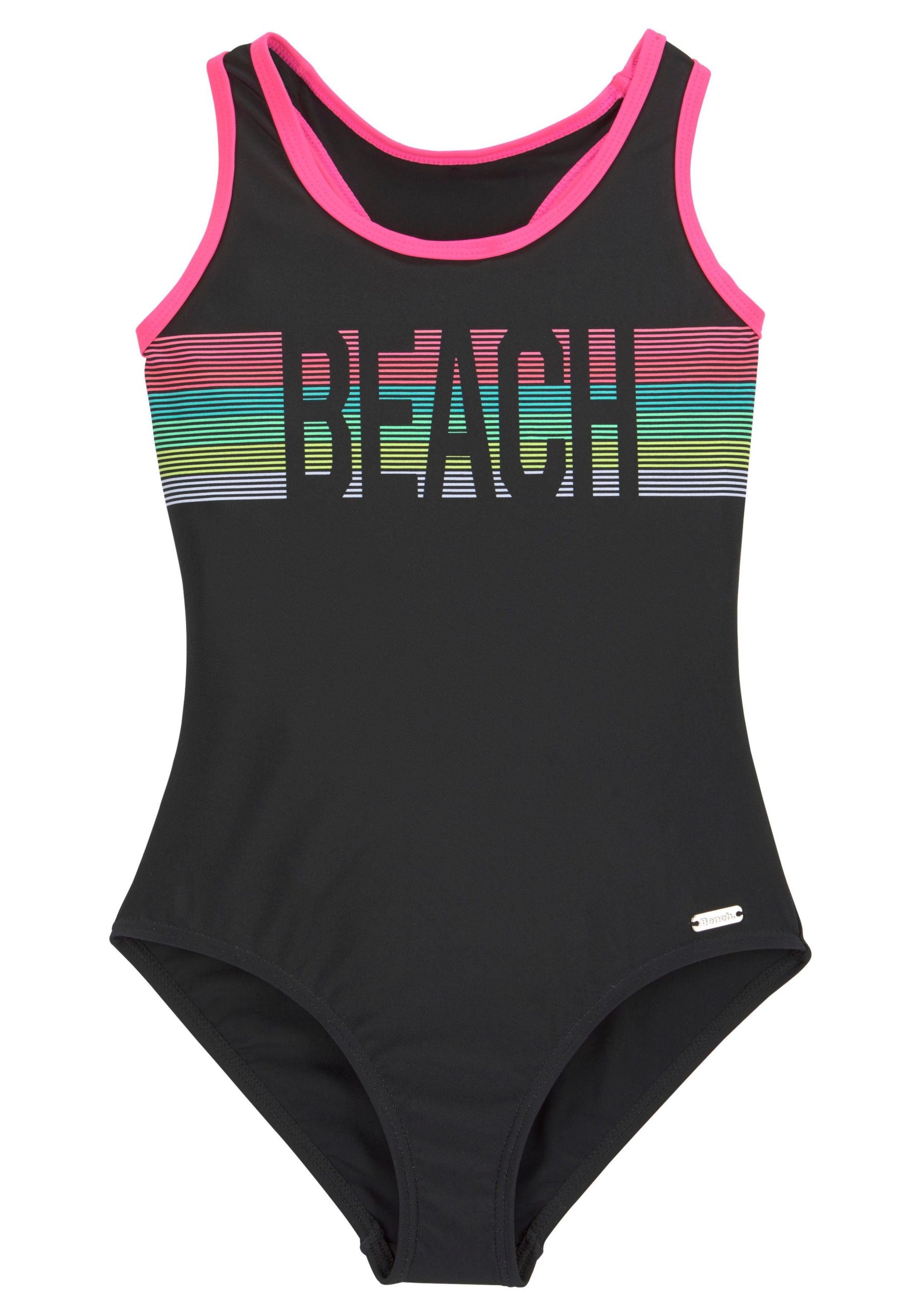 Elevate your swim style with the cool Bench swimsuit! This sporty swimsuit features dynamic stripes, a bold statement print, and a trendy retro design. Contrasting trim accents on the straps complement the swimsuit’s fashionable look. A small metal label adds a touch of detail at the leg opening. Crafted from elastic material, it ensures a comfortable fit without constriction. This Bench swimsuit isn’t just swimwear; it’s a statement. The design boasts a deep, rounded back cutout for a flattering silhouette. Adjustable, contrasting straps allow for a personalized fit.