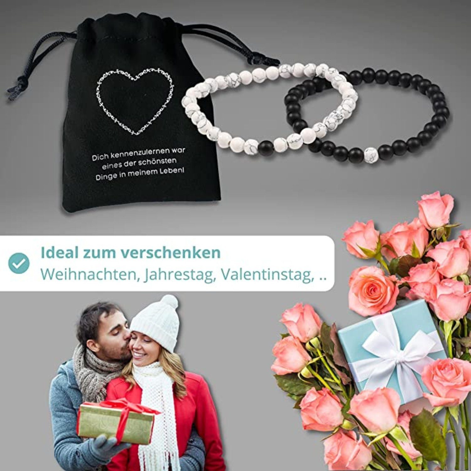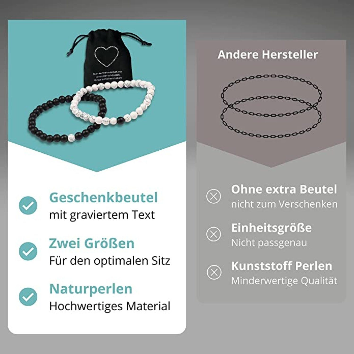Geschenkset zum direkten verschenken. 1x Perlenarmband Schwarz – 1x Perlenarmband Weiß – 1x Gravierter Geschenkbeutel GRATIS. Liebevoll bedruckter Geschenkbeutel.