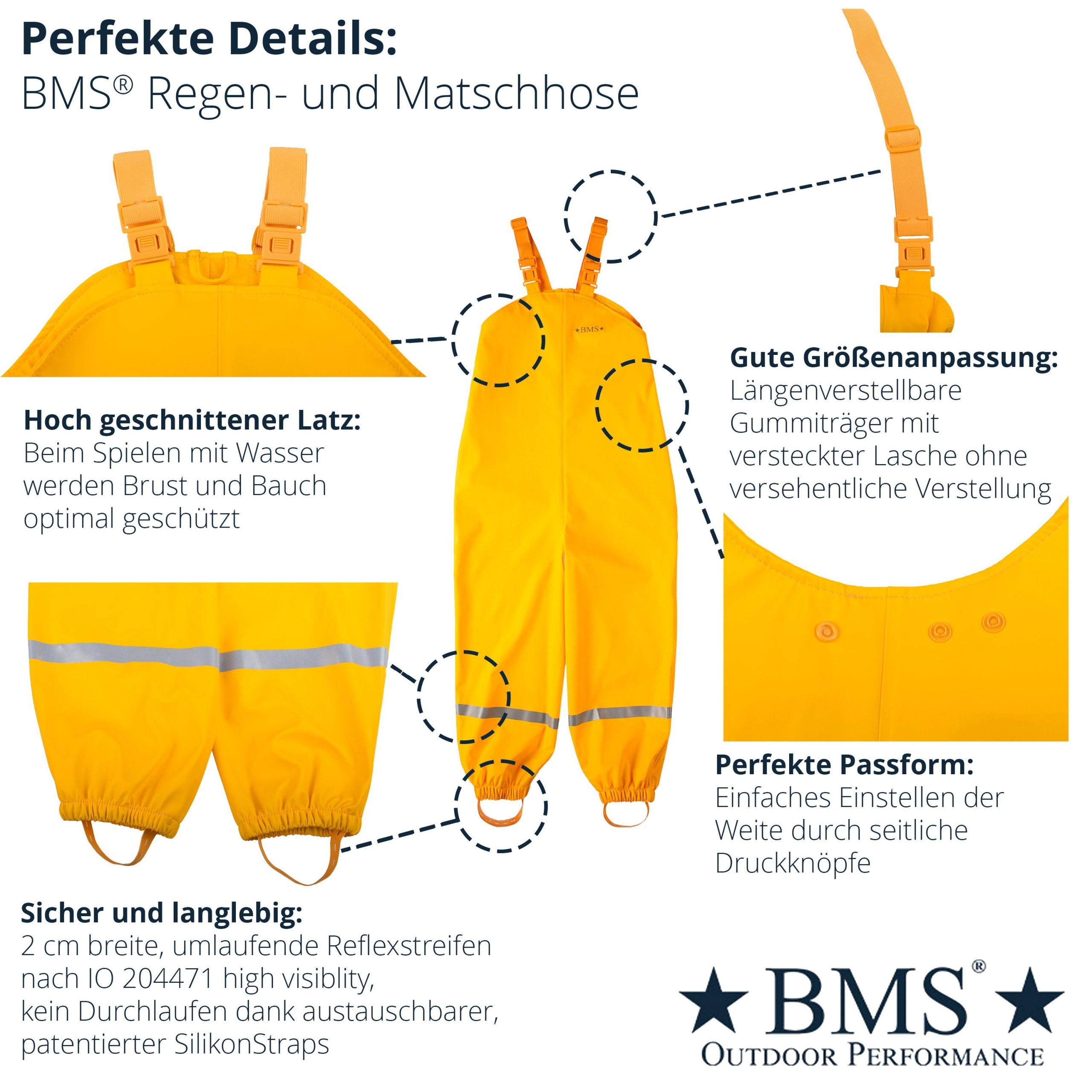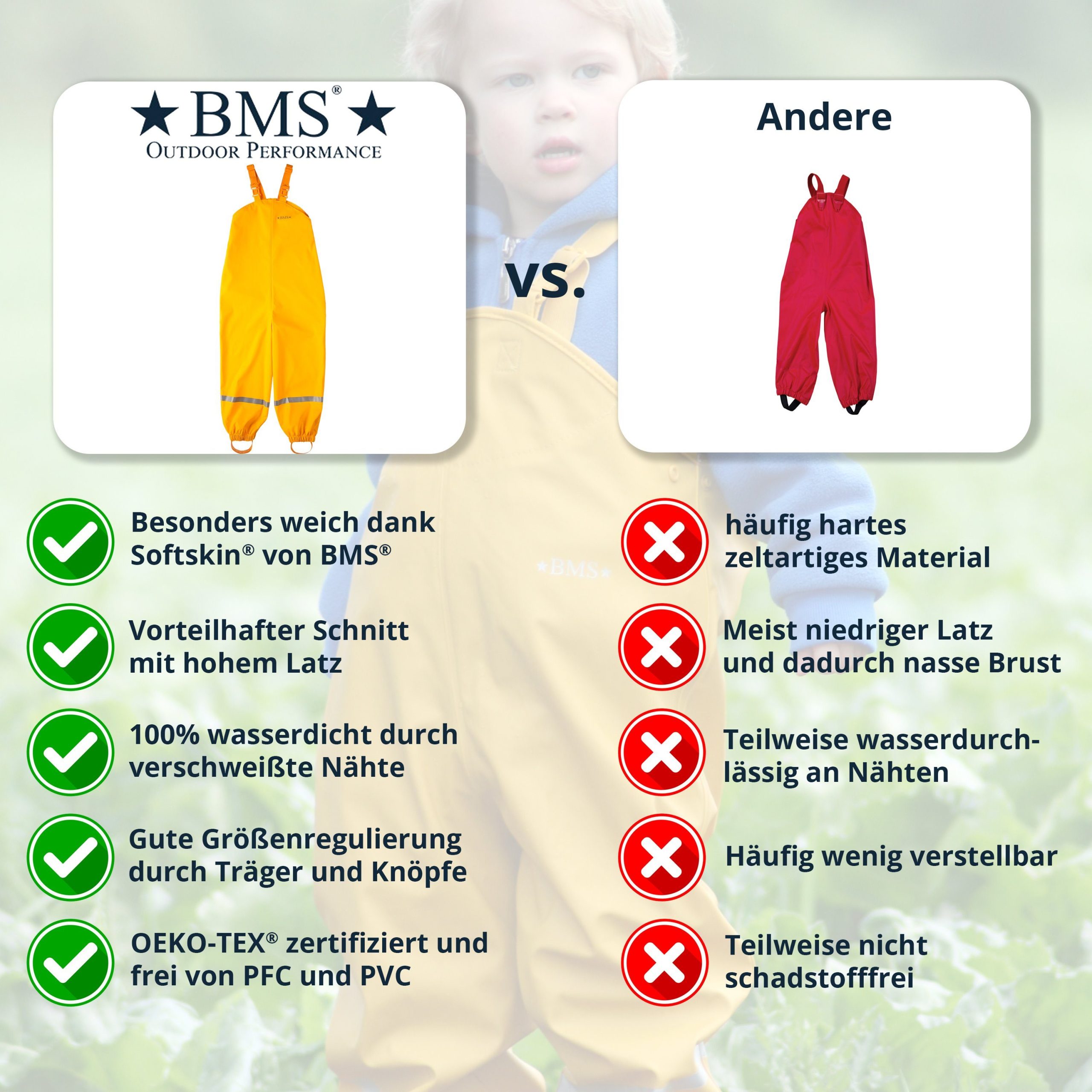 Beschreibung: Praktische Regenlatzhose / Buddelhose von BMS. Eine Matschhose für Regen, Strand und Spielplatz. Gute Größenregulierung durch längenverstellbare Gummistrager und seitliche Druckknöpfe, die man in der Weite verstellen kann. Mit Reflektorstreifen an den Beinen und Gummihund mit regulierbarem Gummisteg an den Fßen, der ein Hochrutschen der Latzhose verhindert.