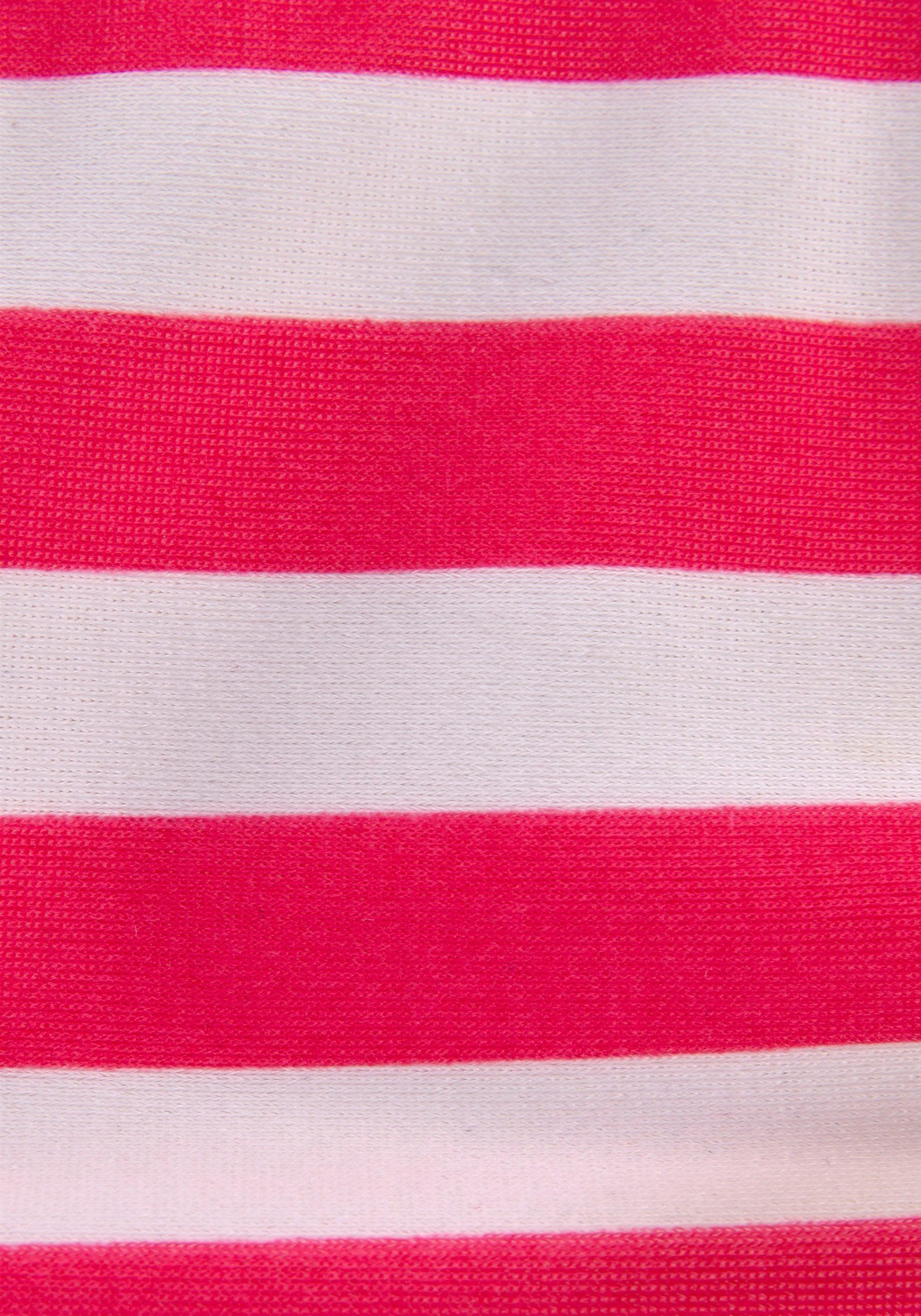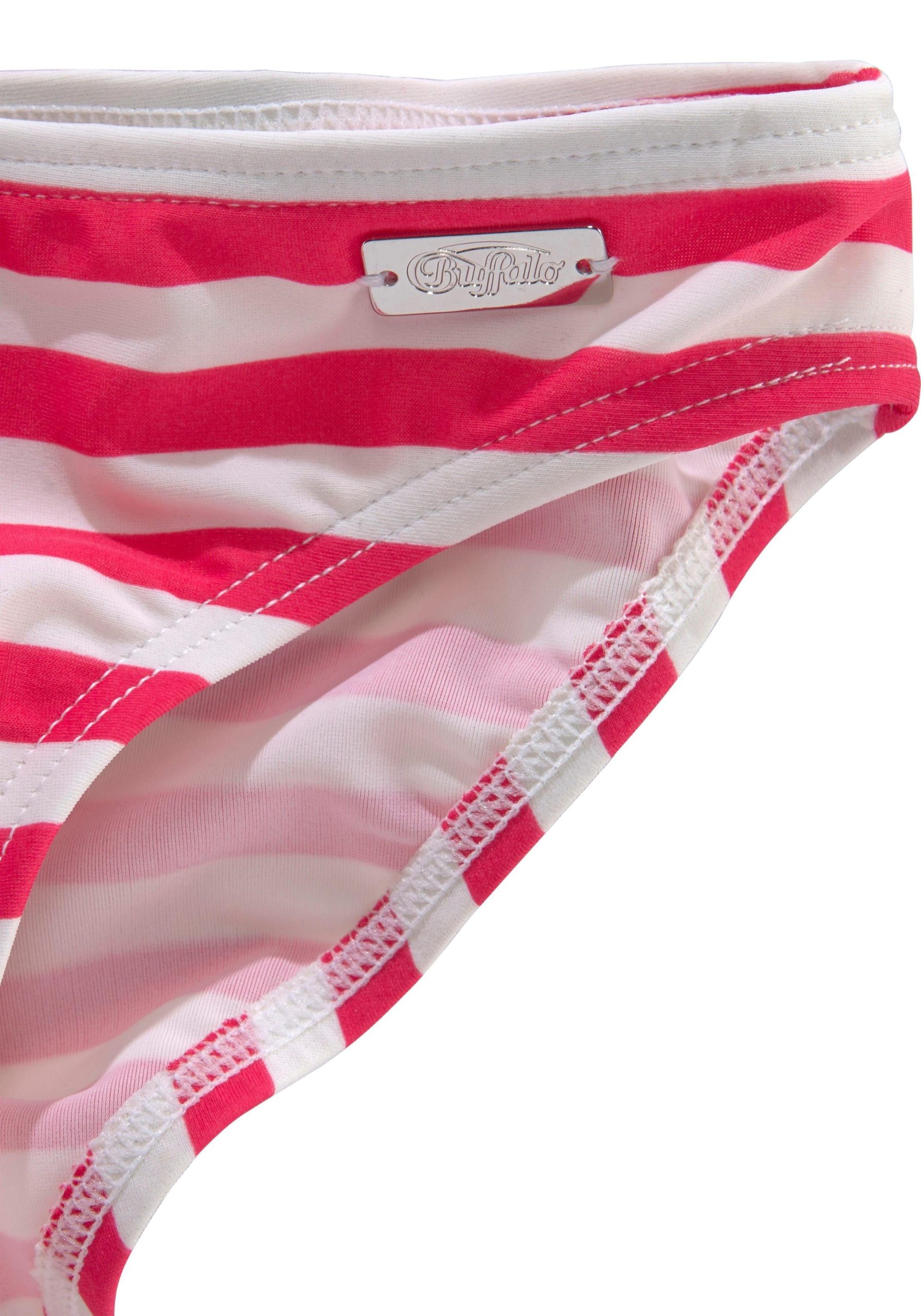 Embrace effortless style with this charming Buffalo Triangel Bikini. This playful bikini masterfully combines a solid-colored top adorned with whimsical roses with maritime stripes on the bottoms. A small metal emblem adds a cool accent to the briefs. The top closes with a clip closure at the back, allowing for easy adjustment of the neck straps to suit your preferences. The elastic, lined material promises a comfortable fit, making this Buffalo Triangel Bikini the perfect choice for fashionable beach days.