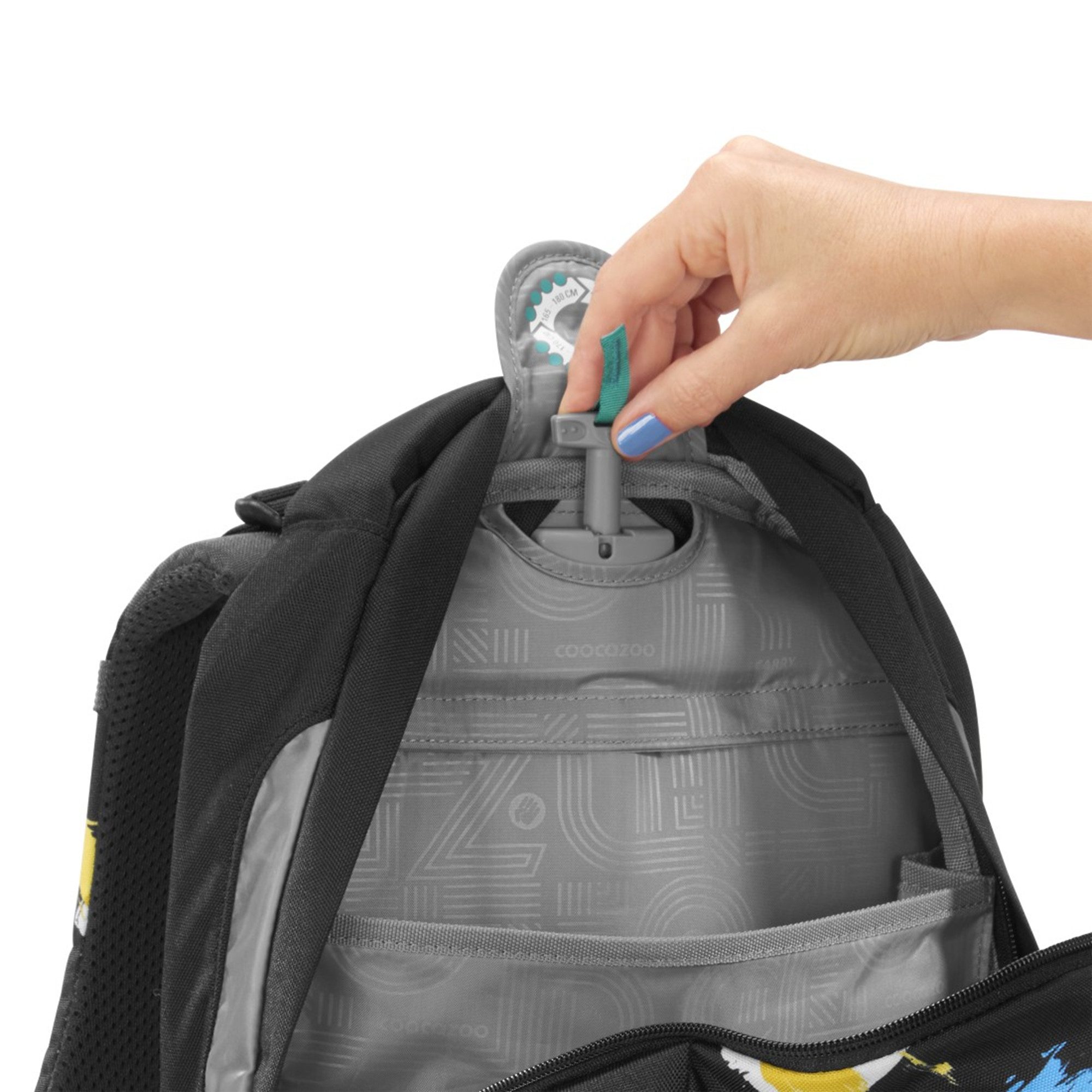 - Rotating mechanism with scale for shoulder strap height adjustment.