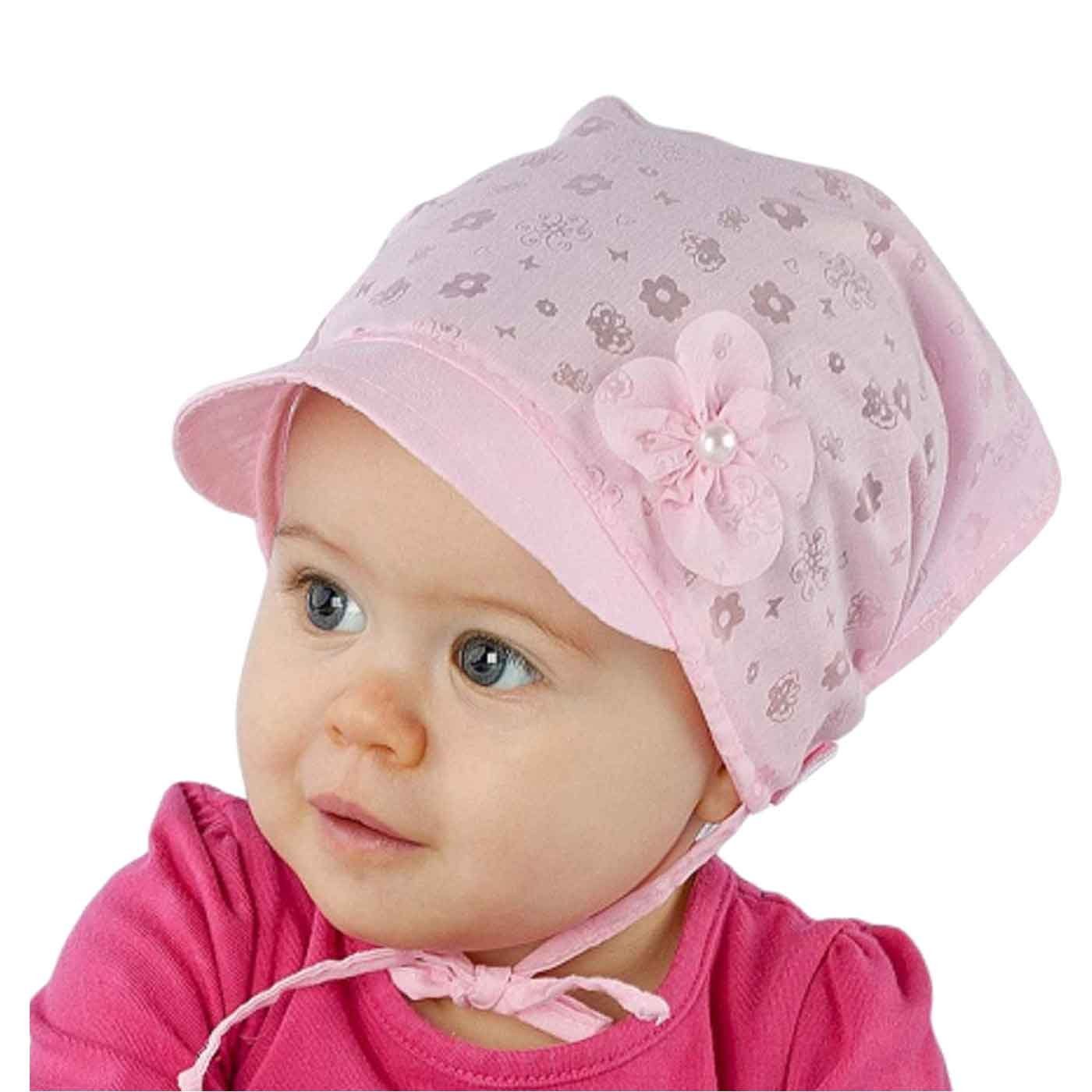 Süße Baby Mädchen Mütze aus dünnem leichtem Stoff mit zartem Blumen-Alover. Die Mädchenmütze kommt mit einem praktischen Schirm, der Schatten spendet. Hinten sorgt ein geraffter Gummi-Band und die zwei Bindebänder für optimalen Halt. Die seitlich angebrachte Blume verleiht der Mütze ein edles Aussehen. Der Schmuckstein kann etwas von der Abbildung abweichen. Die Bindemütze ist hinten offen und sorgt an sonnigen Tagen für ein luftiges Traggefühl. Die Sommermütze ist ein idealer Schutz vor direkter Sonne und ein schönes Accessoire für Ihr Kind.