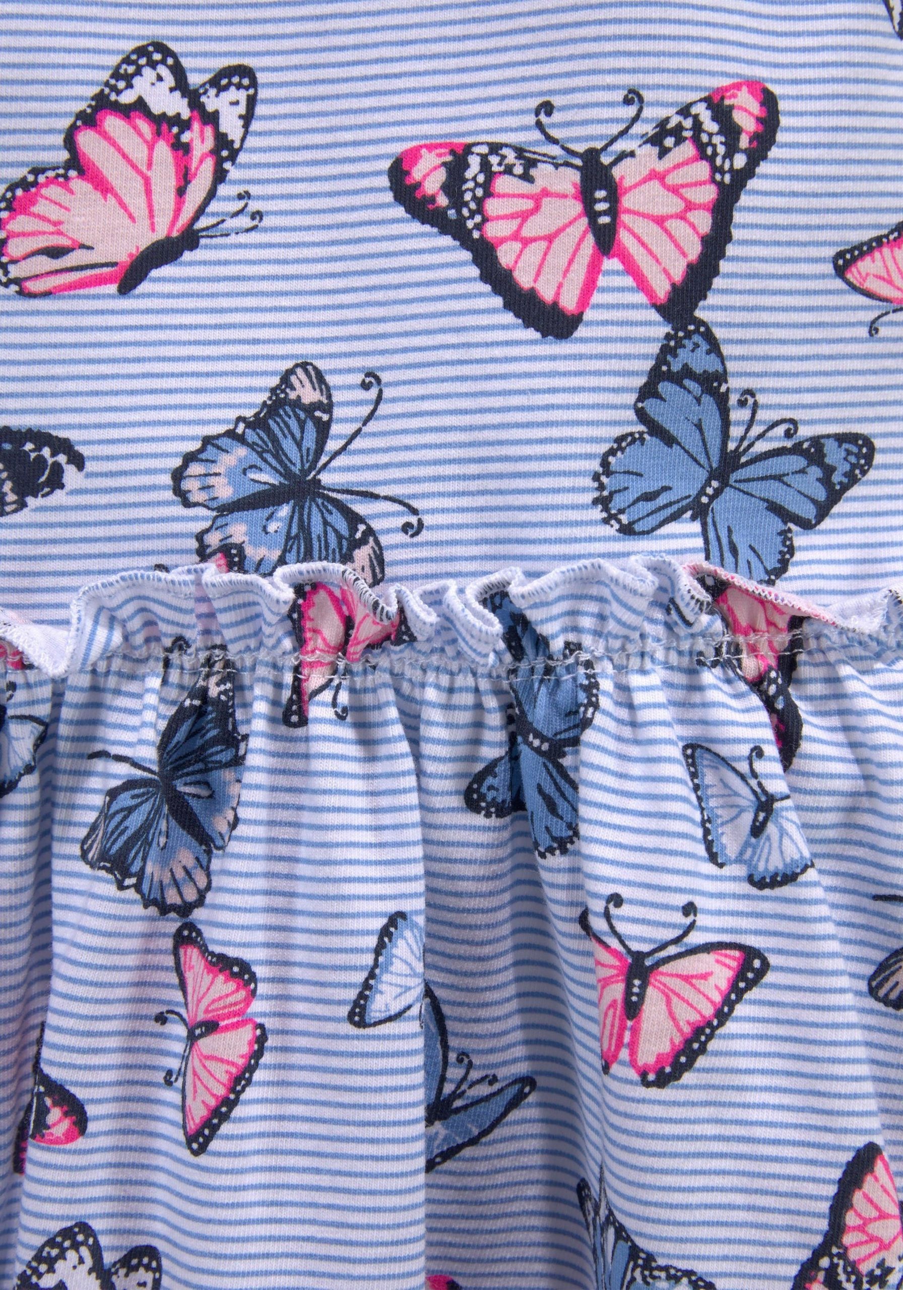 Ein Traum für Mädchen ist das Kleid von KIDSWORLD. Es gefällt mit seinen kleinen Flügelärmeln und dem Rockteil im Faltenlook. Die elastische Taille ist mit kleinen Rüschen besetzt. Richtig wunderbar ist auch der niedliche Print mit Schmetterlingsmuster. Die Qualität aus weichem und elastischem Jersey bietet ein gutes Gefühl beim Tragen. Mit Sandaletten zusammen getragen kommt das Mädchenkleid richtig gut zur Geltung. So schön kann Mode sein: Kleid von KIDSWORLD.