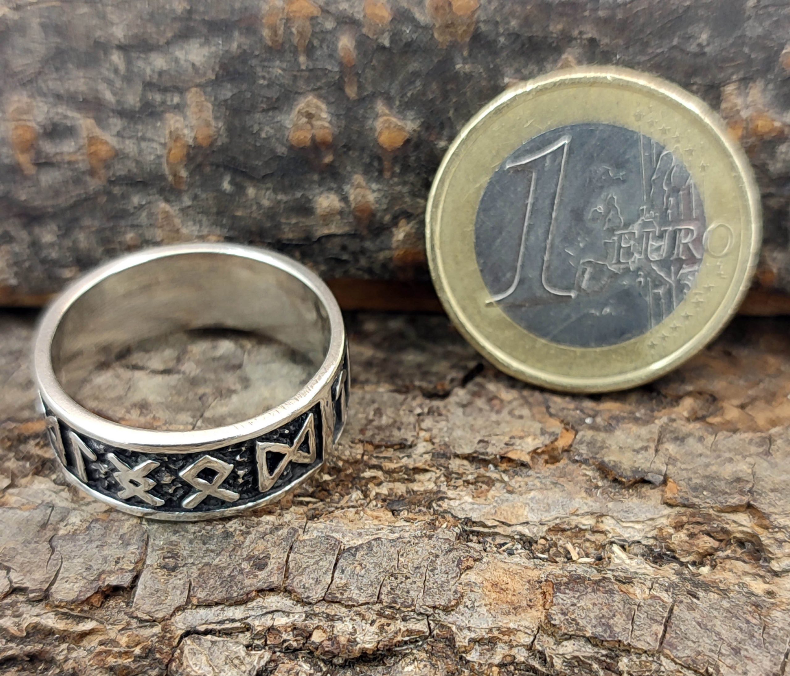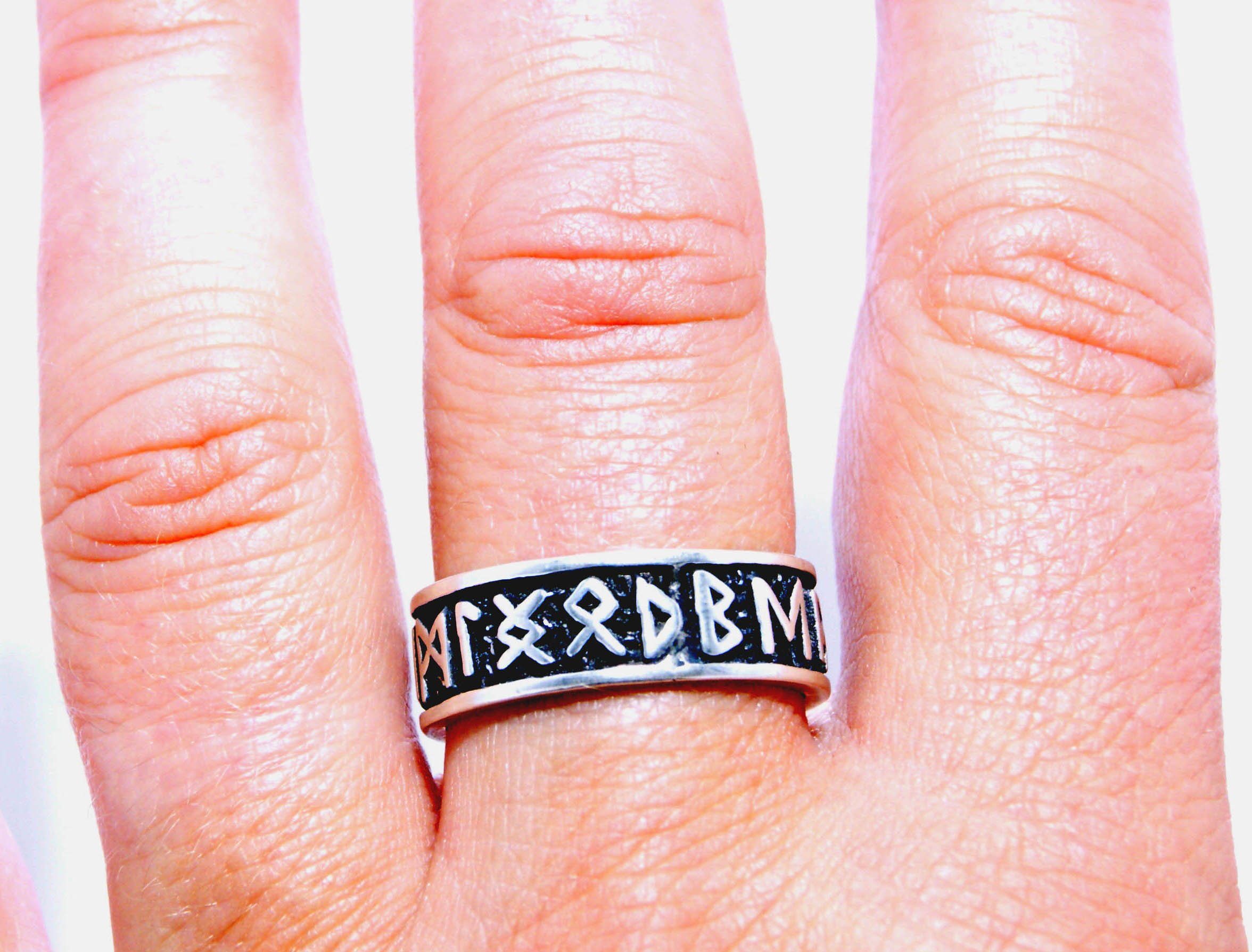 Embrace Norse heritage with this stunning Kiss of Leather silver ring featuring the Elder Futhark runes. Genuine 925 sterling silver, sizes 50-80. A powerful symbol of history and wisdom.