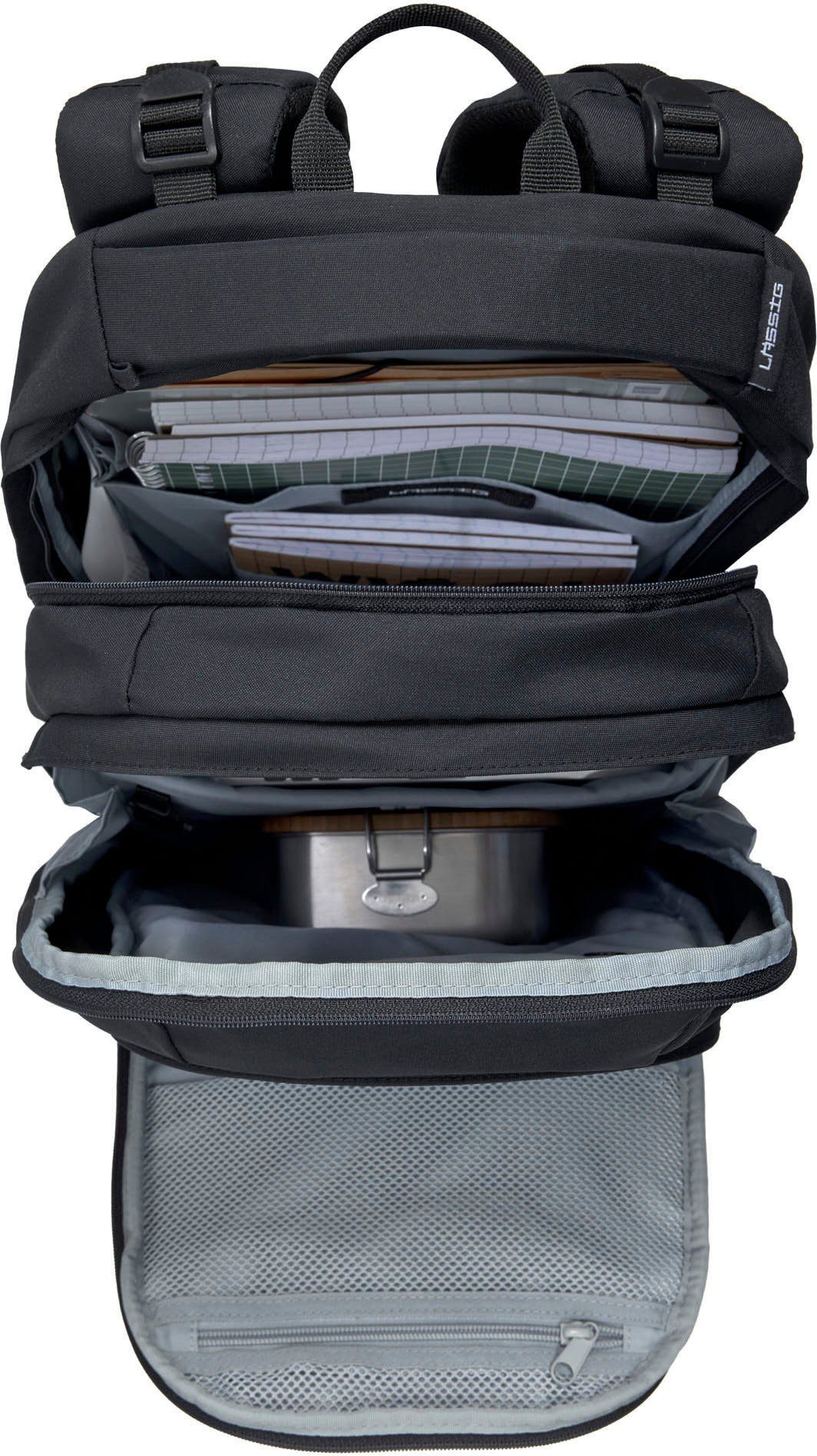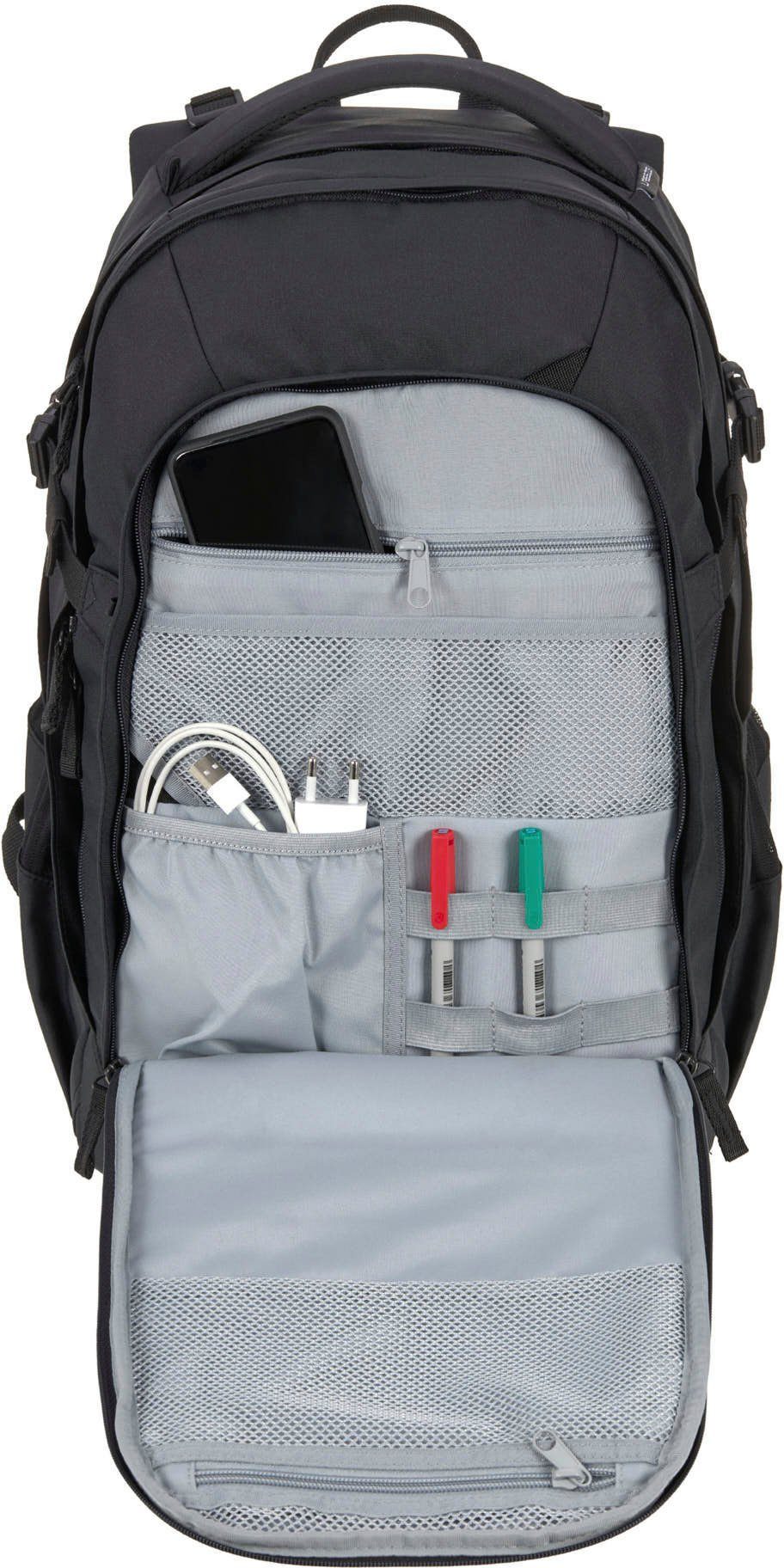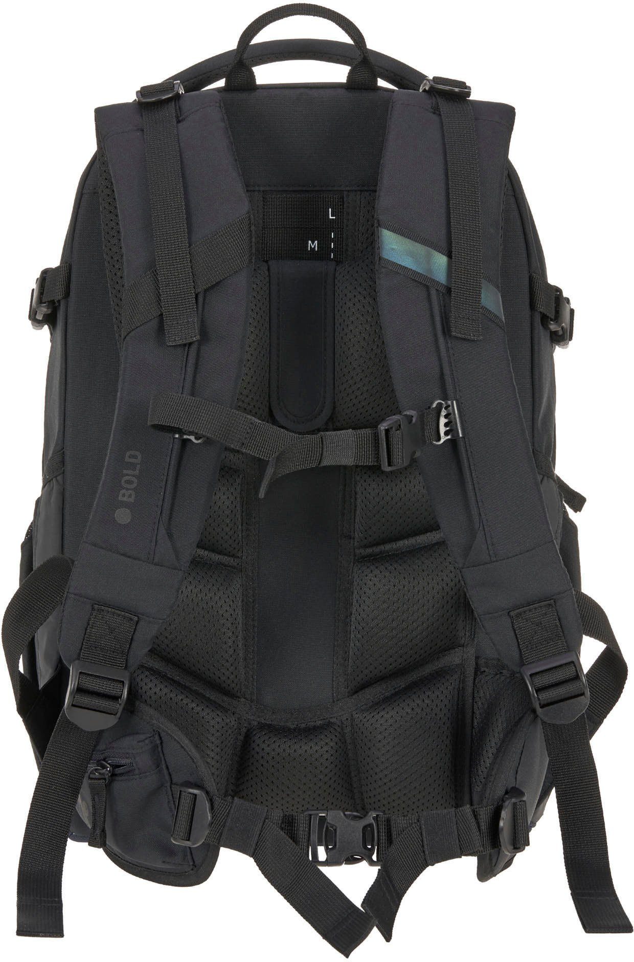 BE BOLD. BE YOU! With your new school backpack, we welcome you to the next level: Upgrade your school style with the BOLD Origin School Backpack! With the school backpack and accessories from the BOLD collection, you will experience new things and surpass yourself. BE BOLD. BE ERGONOMIC. What your parents think: The school backpack must be ergonomic. What that means for you: Your back will be spared. Clear! With the BOLD Origin School Backpack, you can adjust your individual fit with the height-adjustable back panel so that it feels good for you. An adjustable chest strap, carrying straps, the padded back section, and the padded hip belts, which you can easily remove, also relieve your back. Adjustable side straps keep the weight close to your back. BE BOLD. BE LIGHT, STABLE & VISIBLE. With only 1290 g with a volume of 30 l, the BOLD Origin school backpack is a real lightweight. It is also dirt and water repellent. Another plus point that your parents will certainly find interesting: The school backpack is equipped with numerous reflectors on the front and sides for better visibility. BE BOLD. BE CLEVER. Keeping things tidy? No problem with the ORIGIN, because you can look forward to lots of storage space! In addition to the large main compartments, the backpack offers practical pockets for A5 notebooks, books, and your tablet. Particularly important: The extra pocket for your smartphone and the power bank with a headphone jack. Large side pockets offer space for the drinking bottle or the umbrella and are provided with an opening in case something leaks. Helmets or clothing can be easily attached to the strap. In many inner pockets you can store all your things neatly. So you can now decide for yourself how you want to organize yourself! BE BOLD. BE SUSTAINABLE. Sustainability requires courage to go new ways. That’s exactly what you can do with your BOLD Origin Backpack: Courageously! We work every day to get better: As a climate-neutral company, we work every day to act socially and ecologically responsibly – for example, by completely avoiding animal components in the manufacturing process and using fabric made from recycled polyester. Therefore, the fabric of the school backpack is made of 100% polyester (recycled).