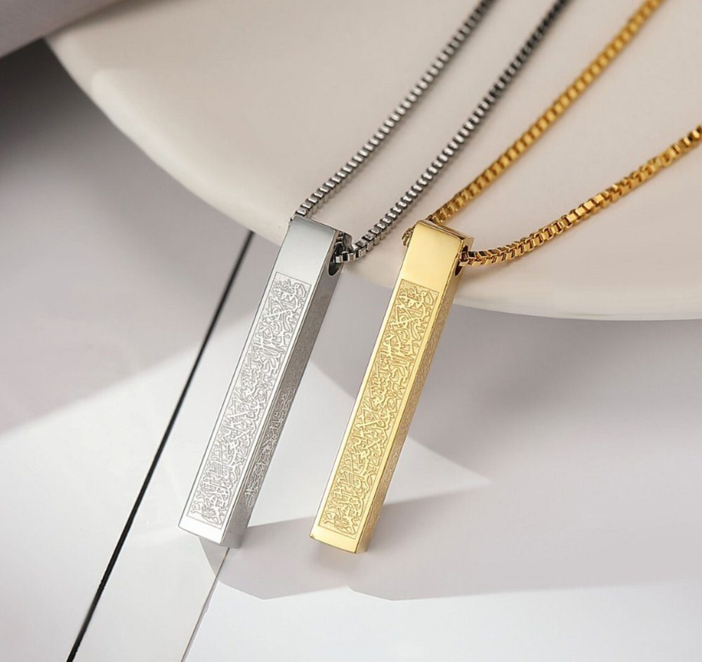 The Lale Collection™ Necklace with Pendant Ayatul Kursi Necklace Gold – Silver Jewelry Islam Muslim Quran, Ayatul Kursi, Jewelry, Accessories, Islam, Quran is a beautiful piece of jewelry that displays the Ayatul Kursi, a verse from the Quran, in Arabic calligraphy. The necklace is made of high-quality stainless steel and is available in two different colors: gold and silver.