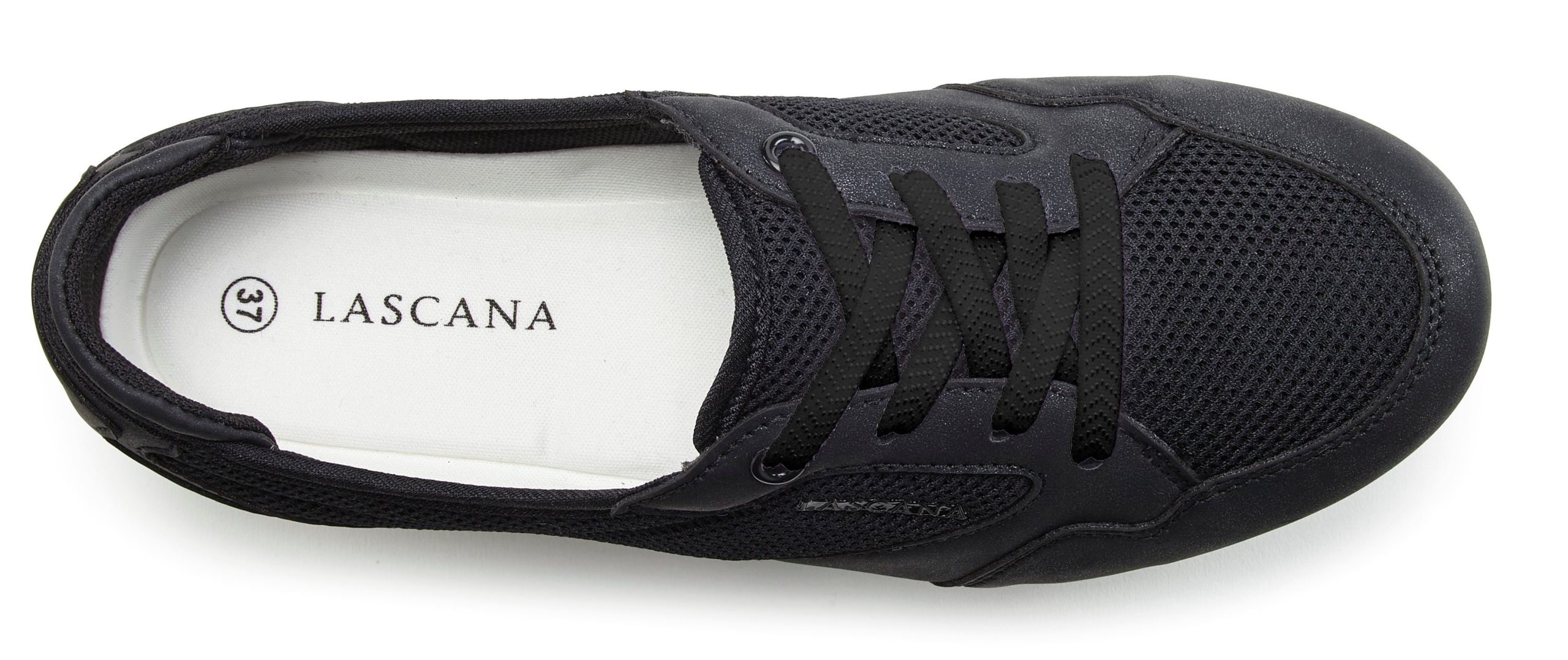 Die Sneaker von Lascana in modischer Mesh-Optik bringen frishen Wind in deine Schuhsammlung. Dezent Metallic-Details verleihen ihnen einen Hauch von Eleganz, ohne dabei aufdringlich zu wirken. Dank der praktischen Schlupfform genießt du einen einfachen Ein- und Ausstieg, was diese Sneaker zum idealen Begleiter für den Alltag macht. Ob in der Freizeit oder im Büro, kombinierbar mit Jeans, Kleidern oder Shorts – mit diesen Freizeitschuhen von Lascana liegst du immer richtig. Die herausnehmbare Innensohle macht sie auch für lose Einlagen zur perfekten Wahl. Das Obermaterial, das Futter sowie die Decksohle und die Laufsohle garantieren Komfort und Langlebigkeit.