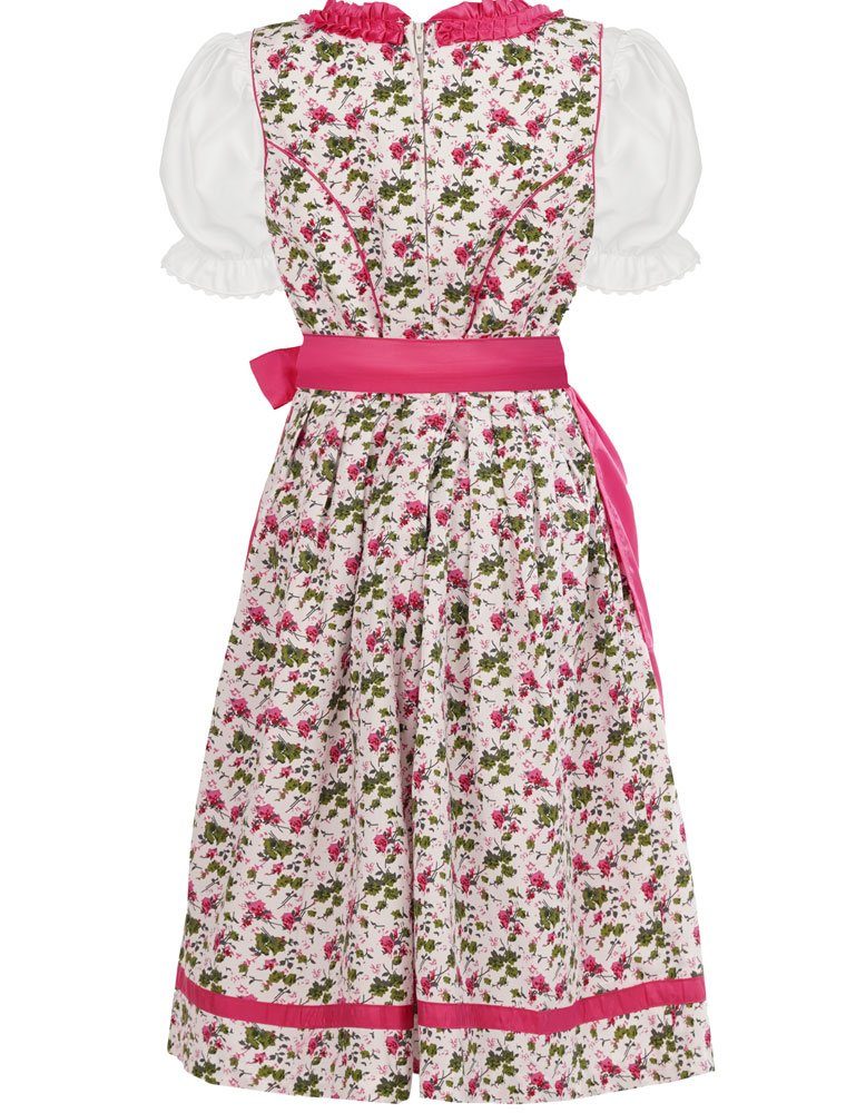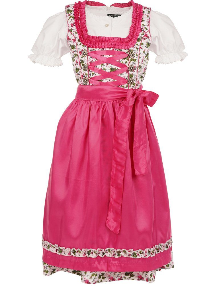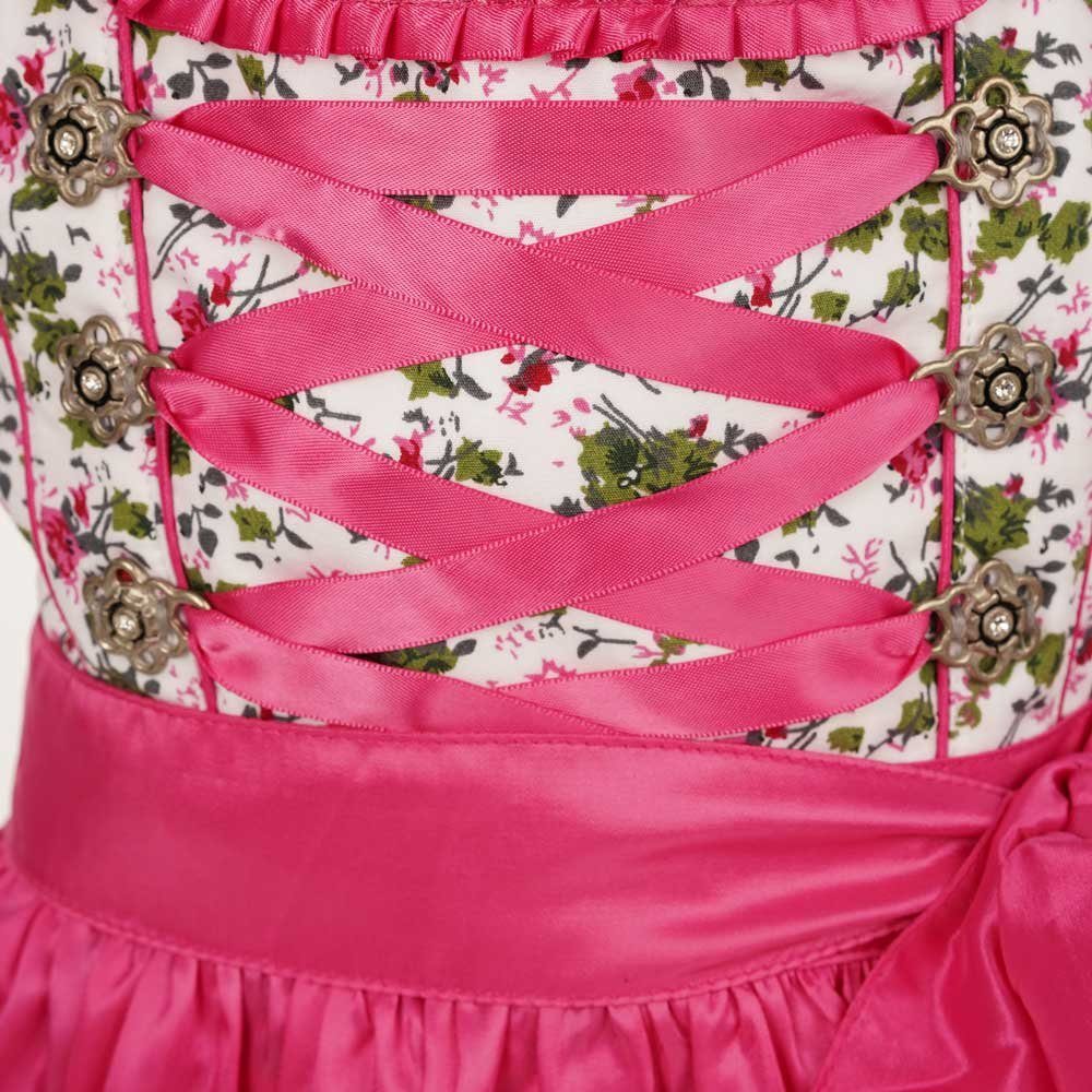Das weiße Kleid zieren hübsche Blumen in rosa, pink und grün. In Saumnähe befindet sich ein süßer Zierstich im Stoff der Schürze. Das Dirndl wird hinten mit einem Reißverschluss geschlossen. Den Brustbereich ziert eine Schnürung mit Metallknöpfen in Blumenform mit Strass Elementen und einem feinen rosenfarbenen Band in Satinoptik. Der Ausschnitt wird von einer rosa Rüsche betont. Das Highlight des 3-teiligen Dirndls ist die rosa, seidig glänzende Schürze, deren Stoff ein bisschen an Wildseide erinnert. Einfach bezaubernd! Das süße Dirndl wird komplett mit einer weißen Bluse geliefert. Diese ist aus einem angenehm zu tragendem Material gefertigt und am Ausschnitt und den Ärmeln mit einer Wellen-Borte verziert. Dieses Dirndlkleid für Mädchen ist mit viel Liebe zum Detail gefertigt und wird Sie und Ihre Tochter mit Sicherheit begeistern. Es ist perfekt für festliche Anlässe und Hochzeiten, aber auch sehr süß für den Besuch beim Volks- oder Oktoberfest.