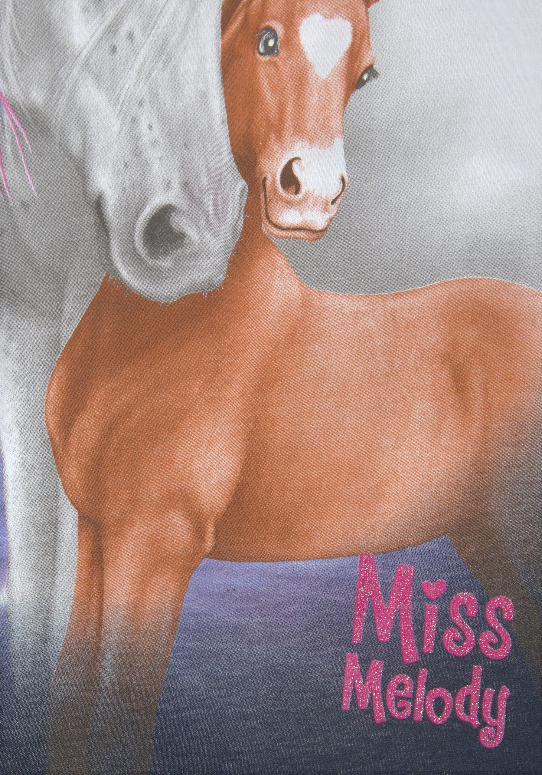 Let your little equestrian fan shine with this adorable 2-piece Miss Melody set! This set features a cozy long-sleeve shirt and comfortable leggings, both adorned with delightful Miss Melody prints and sparkling glitter accents. The shirt boasts a relaxed, asymmetrical hemline and a classic round neckline for a trendy look. The stretchy leggings offer a snug fit thanks to the wide, elastic waistband. Made with a soft jersey blend, this set feels wonderful against the skin. Pair it with cool sneakers for the perfect, everyday equestrian-inspired outfit! This Miss Melody set is sure to be a favorite for playdates and adventures.