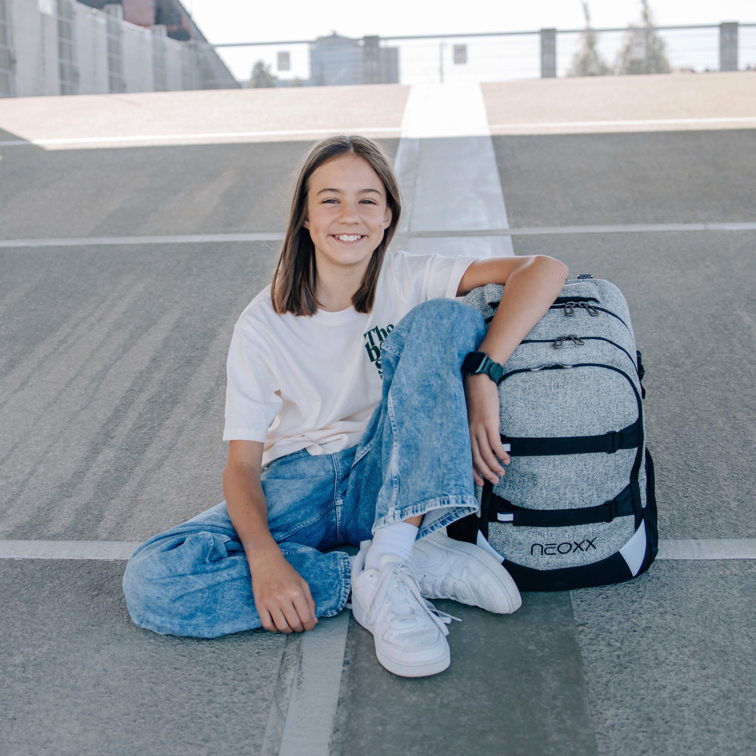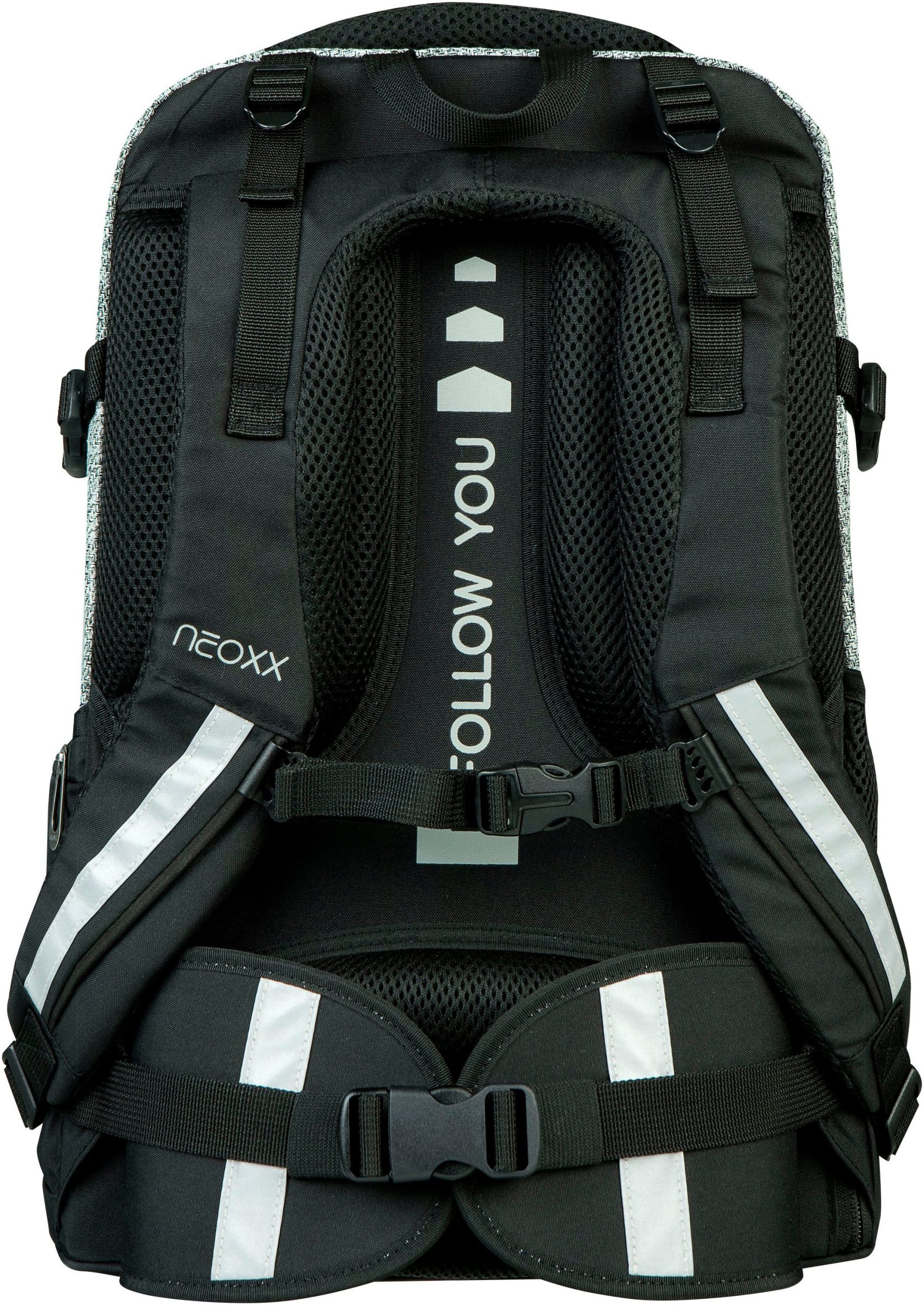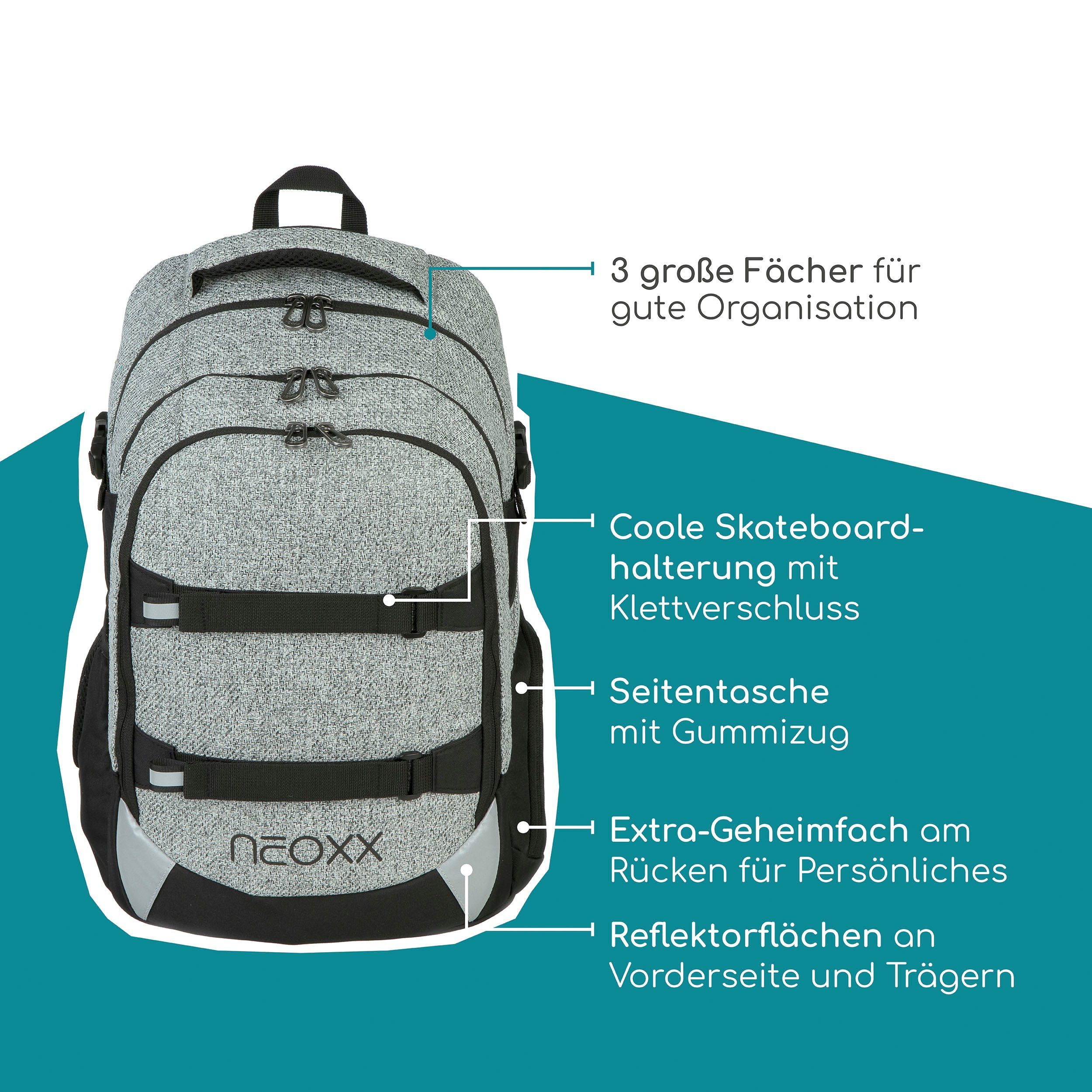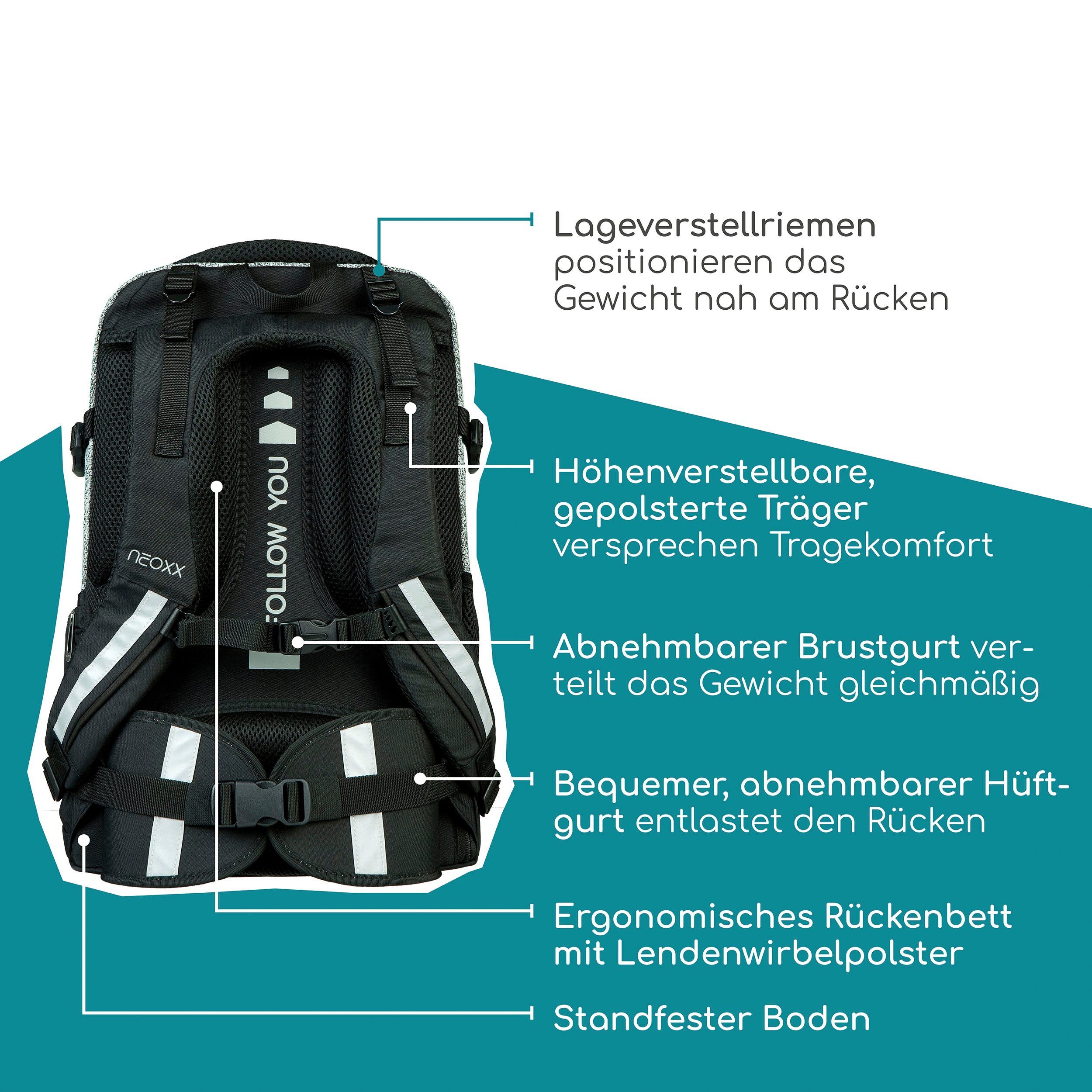 Der neoxx »Active Pro« Schulrucksack ist dein perfekter Begleiter ab der 5. Klasse. Der »Active Pro« Schulrucksack bietet jede Menge Stauraum für all deine Sachen: Mit ca. 26 Litern Volumen passt echt viel rein. Es gibt ein großes Fach mit Laptop-Organizer, Platz auch für sperrige Ordner und ein separates Fach für Hefte. Das Vorderfach bietet einen praktischen Netz-Organizer, Stifteschlaufen und ein Schlüsselband. Seitliche Fächer mit Reißverschluss sowie ein Gummizugband bieten Platz für Flaschen oder andere Dinge, die du schnell zur Hand haben möchtest. Der »Active Pro« Schulrucksack bietet auch höchsten Tragekomfort. Dank des gepolsterten Rückenbetts und den höhenverstellbaren, gepolsterten Trägern kannst du ihn bequem tragen. Der abnehmbare Hüftgurt entlastet deinen Rücken zusätzlich und durch den Brustgurt wird das Gewicht gleichmäßig verteilt. Mit den Lageverstellriemen und seitlichen Kompressionsriemen kannst du das Gewicht nah an deinem Rücken positionieren. Damit du auch im Straßenverkehr gut sichtbar bist, verfügt der »Active Pro« Schulrucksack über dezent Reflektorflächen an der Vorderseite und den Trägern. Der Rucksack besteht aus wasserabweisenden und robusten Materialien, damit er dich in jeder Situation begleiten kann. Mit dem neoxx Active Schulrucksack leistest du auch einen Beitrag zum Umweltschutz. Das Innenfutter des »Active Pro« Schulrucksacks besteht zu 100% aus recycelten PET-Flaschen. Für jeden Rucksack werden ca. 13 Flaschen recycelt. Zusätzlich hilft neoxx in Zusammenarbeit mit der Turtle Foundation Meeresschildkröten in einer sicheren Umgebung zu schlüpfen.