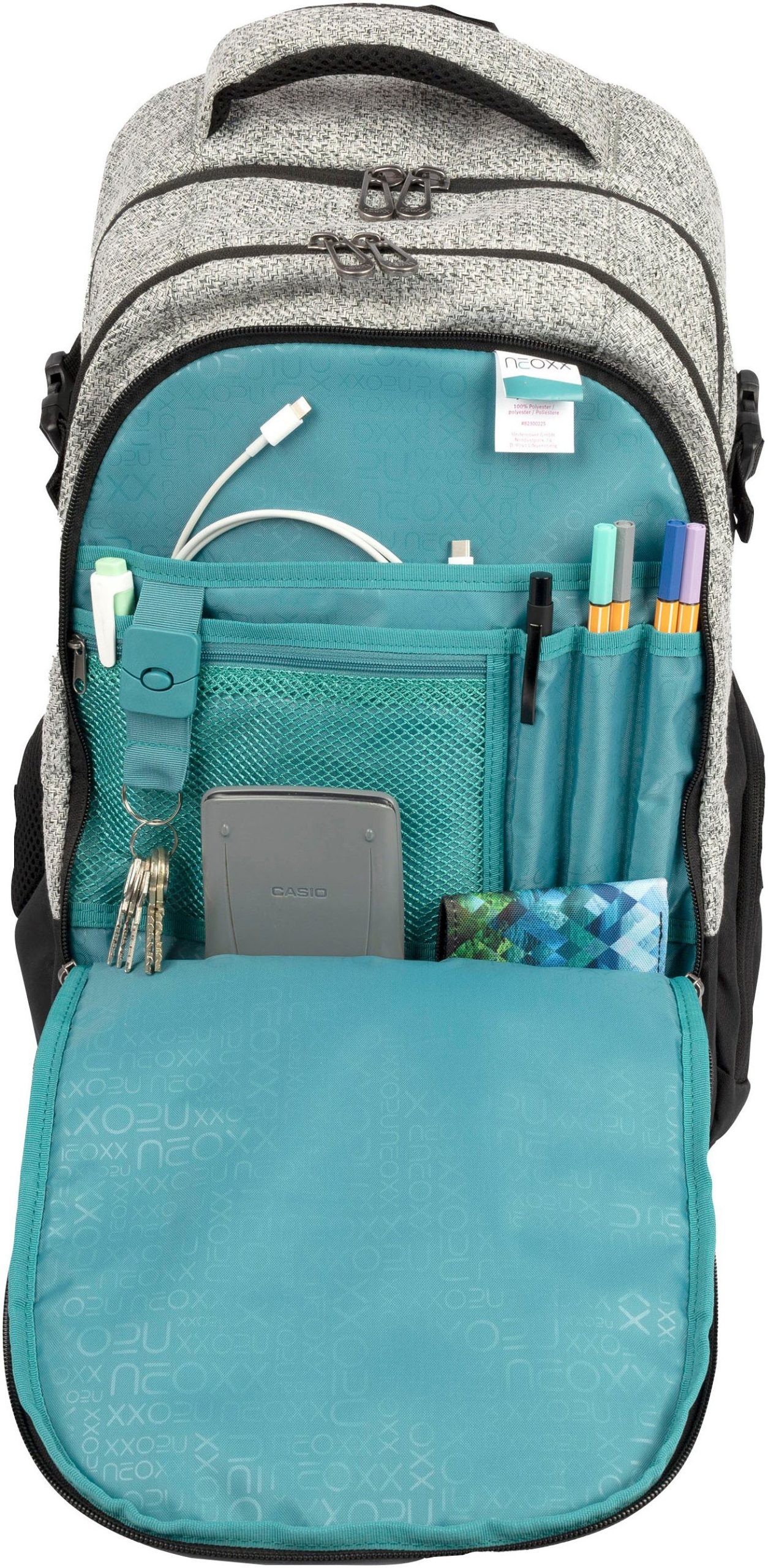 - Vorderfach mit Netz-Organizer, Stifteschlaufen und Schlüsselband
