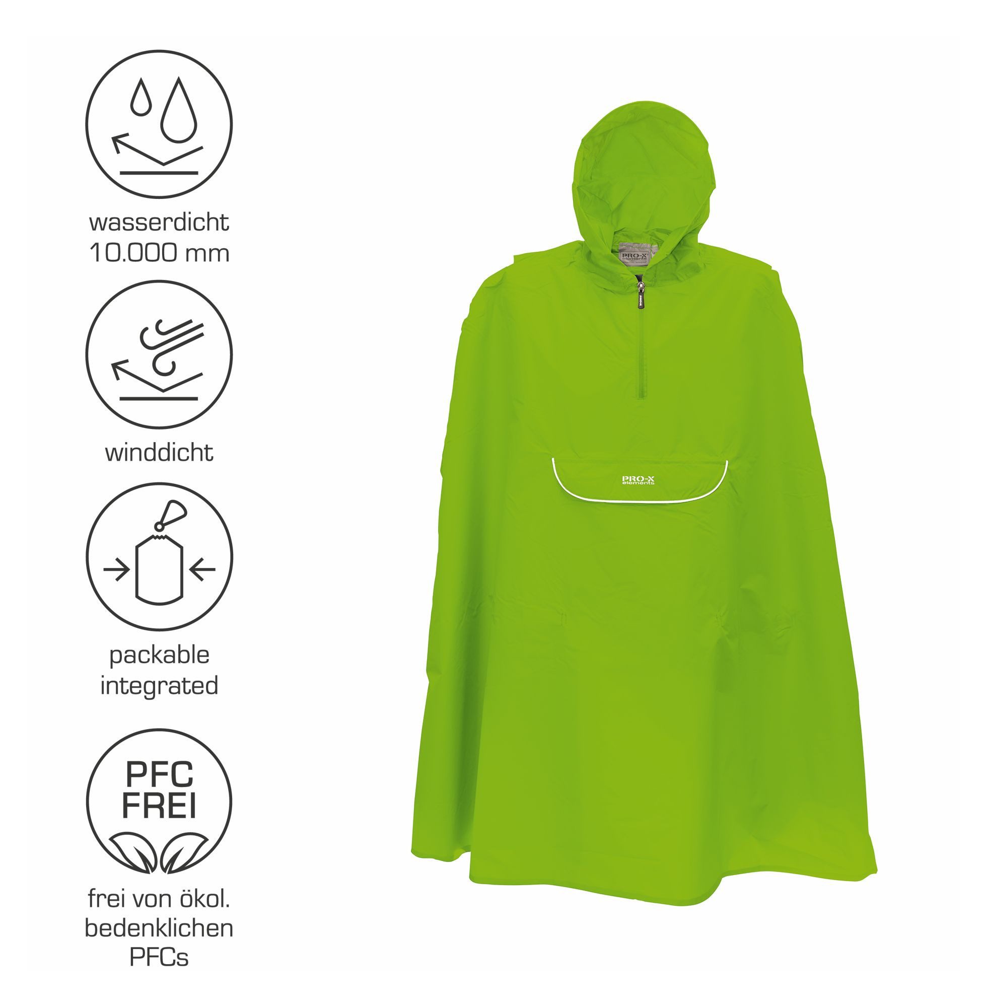 Pro-X Elements Pasofino Unisex Fahrrad Regenponcho: Waterproof protection with a large chest pocket/belt pack, brimmed hood, and reflective strips. Spacious back design for carrying essentials.