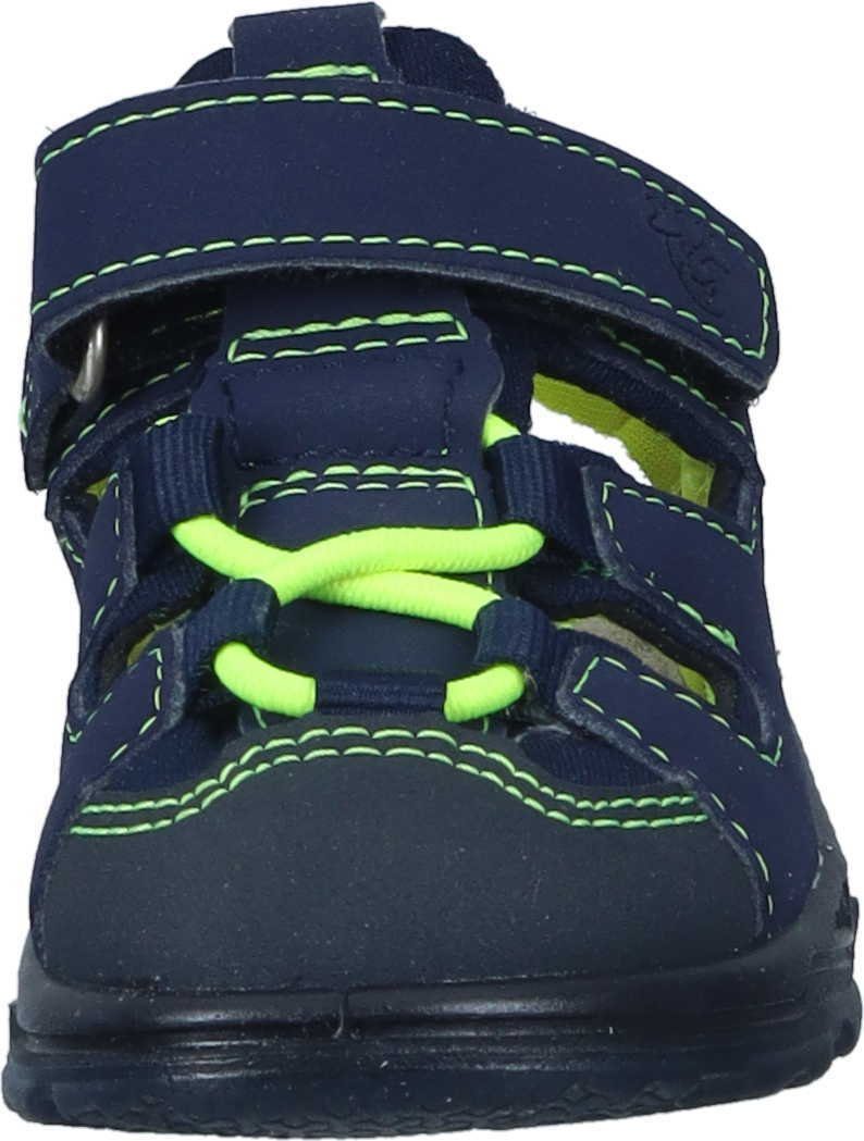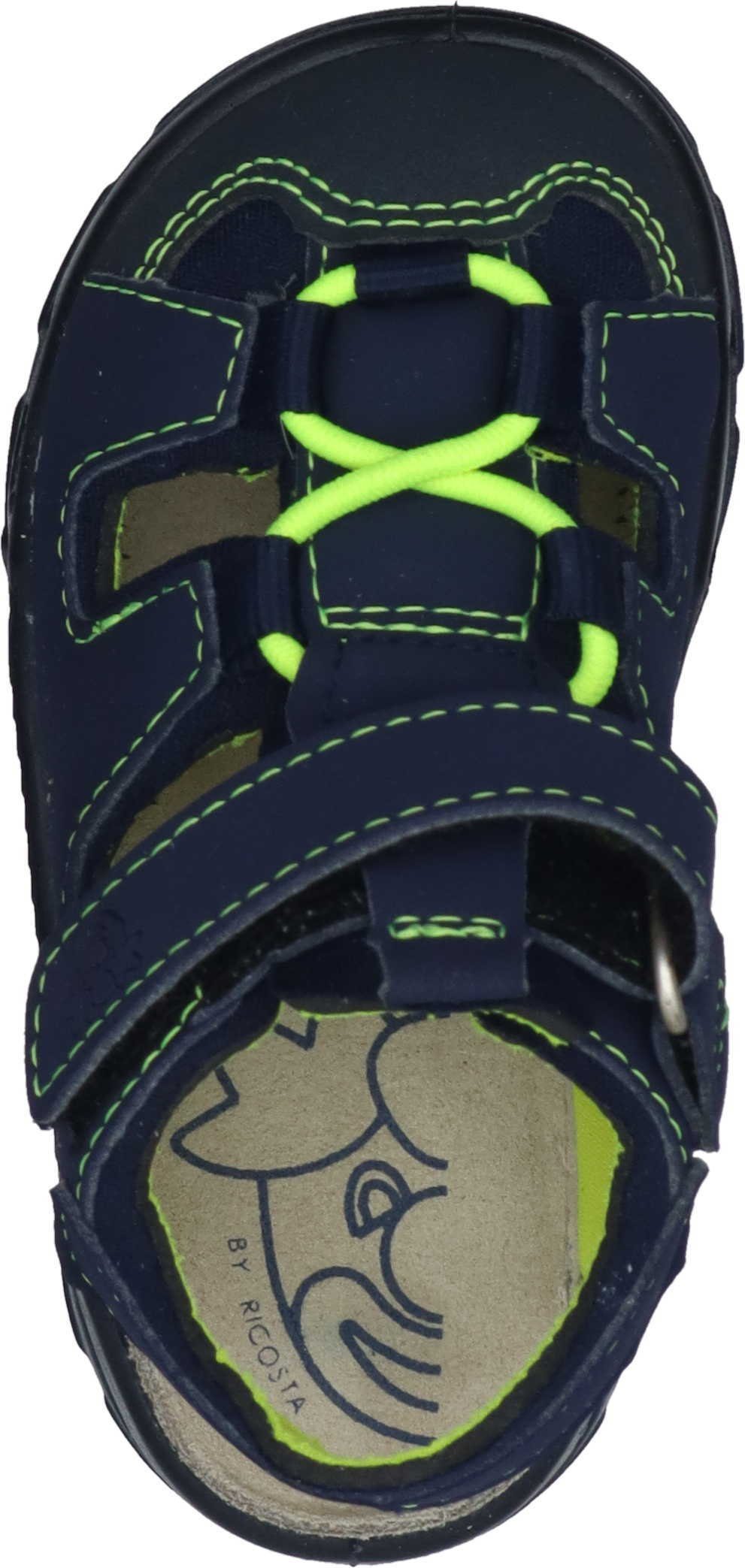Lauflernsandale für Jungen aus dem Hause Ricosta aus einem feinen hochwertigem Synthetikmaterial. Innen ist der Schuh mit einem weichen und atmungsactiven Synthetikmaterial ausgestattet. Das Fußbett (nicht auswechselbar) ist mit Leder bezogen und sorgt für ein angenehmes Fußklima. Die Schuhform wurde nach dem WMS-Weitensystem entwickelt und hat die WMS-Weite M. Dies garantiert optimale Passform für die „kleinen“ Füße. Der Absatz ist durchgehend flach, die aus einem weichen PU-Material bestehende Laufsohle schont die Gelenke und federt jeden Tritt optimal ab. Klettverschlüsse halten den Schuh sicher am Fuß und sorgen auch für die individuelle und optimale Anpassung. Die karree-förmige Schuhform hat zwei Vorteile: Sie wirkt sportlich und bietet einen angenehmen Tragecomfort für den Fuß und die Fußzehen.