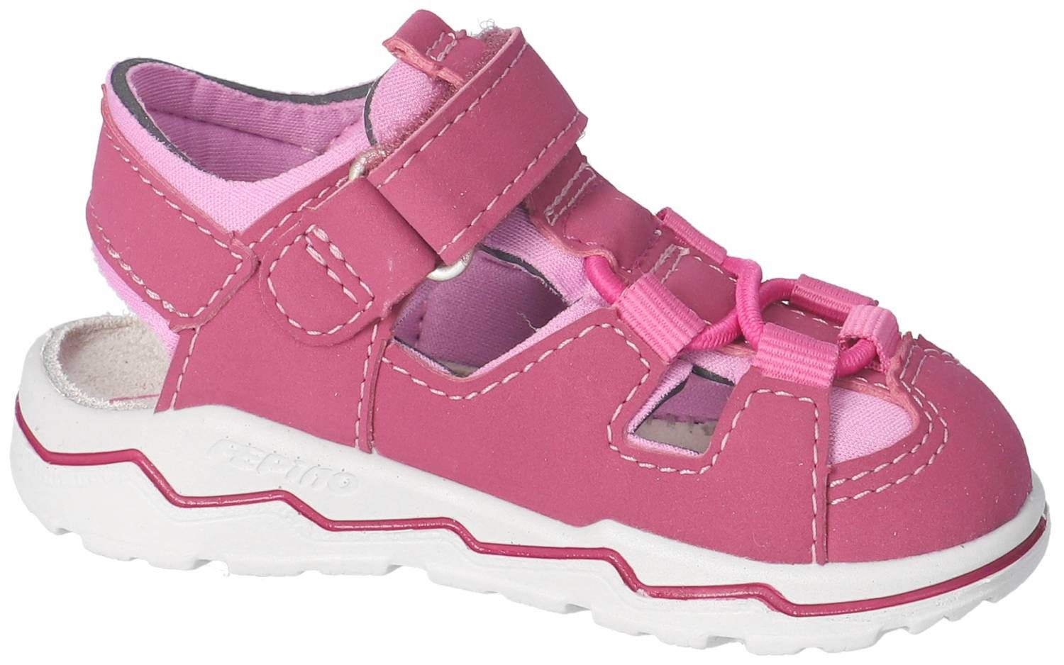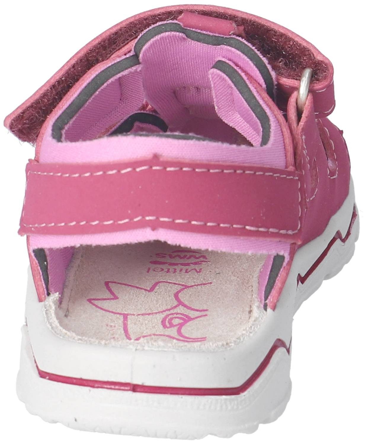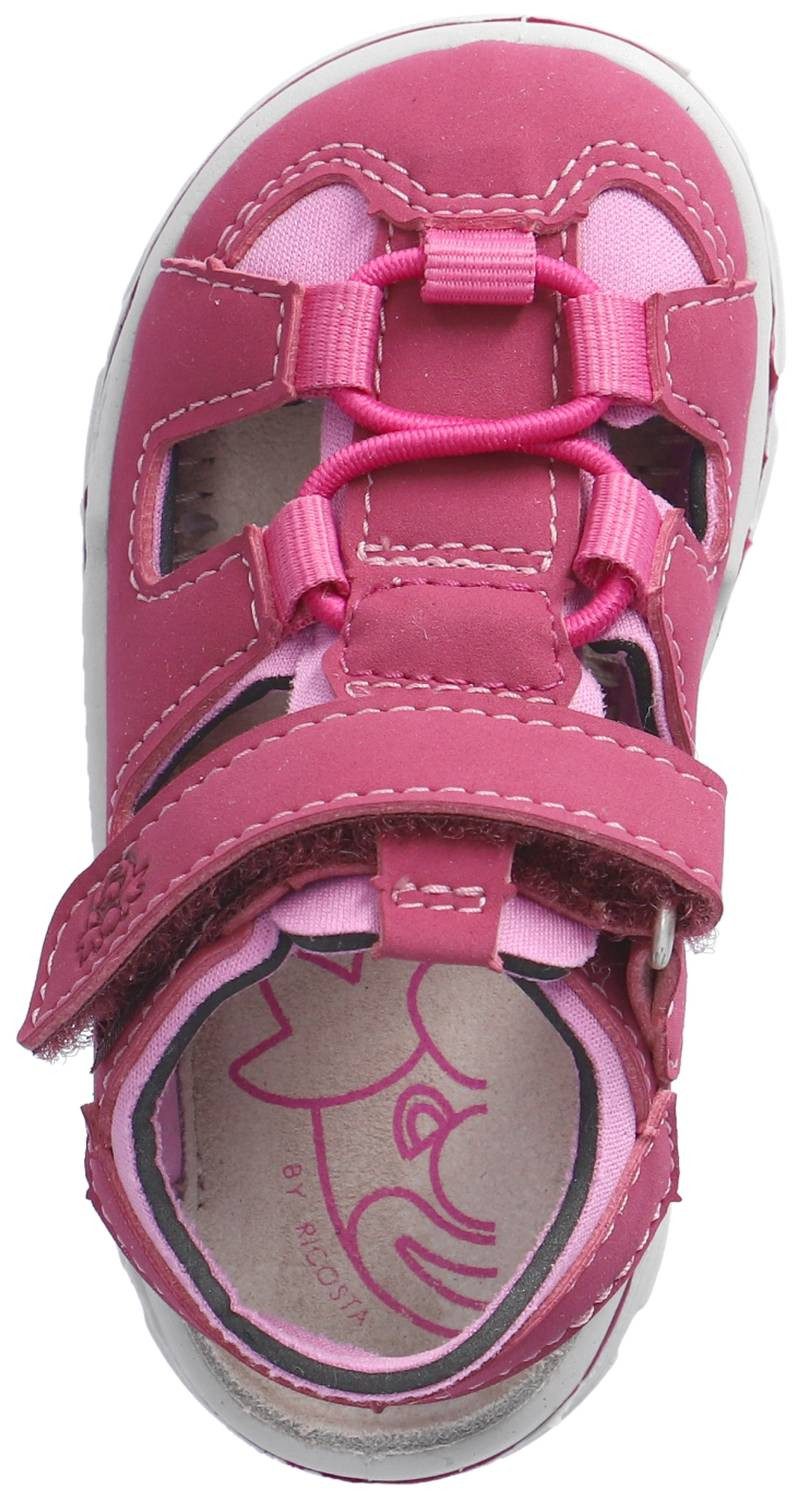Lauflernsandale für Jungen aus dem Hause Ricosta aus einem feinen hochwertigem Synthetikmaterial. Innen ist der Schuh mit einem weichen und atmungsactiven Synthetikmaterial ausgestattet. Das Fußbett (nicht auswechselbar) ist mit Leder bezogen und sorgt für ein angenehmes Fußklima. Die Schuhform wurde nach dem WMS-Weitensystem entwickelt und hat die WMS-Weite M. Dies garantiert optimale Passform für die „kleinen“ Füße. Der Absatz ist durchgehend flach, die aus einem weichen PU-Material bestehende Laufsohle schont die Gelenke und federt jeden Tritt optimal ab. Klettverschlüsse halten den Schuh sicher am Fuß und sorgen auch für die individuelle und optimale Anpassung. Die karree-förmige Schuhform hat zwei Vorteile: Sie wirkt sportlich und bietet einen angenehmen Tragecomfort für den Fuß und die Fußzehen.