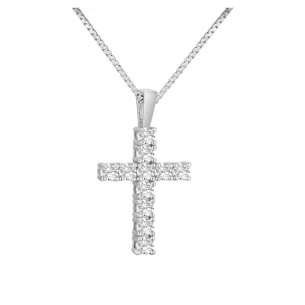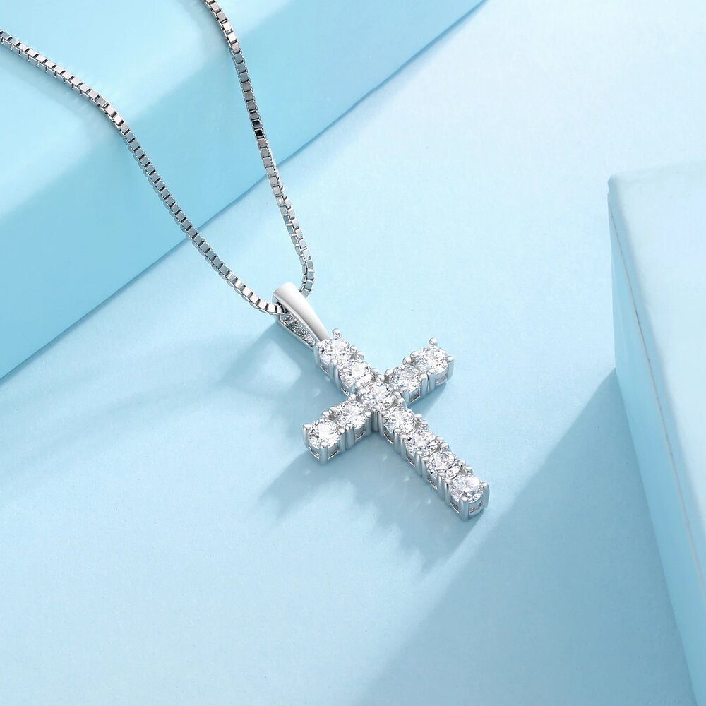 ROUGEMONT Moissanit-Kreuz-Halskette: Luxuriöses Design aus 925 Sterling Silber mit 18K Gold-Beschichtung und funkelnden Moissanit-Steinen. Eine ethische und nachhalstige Alternative zu Diamanten.