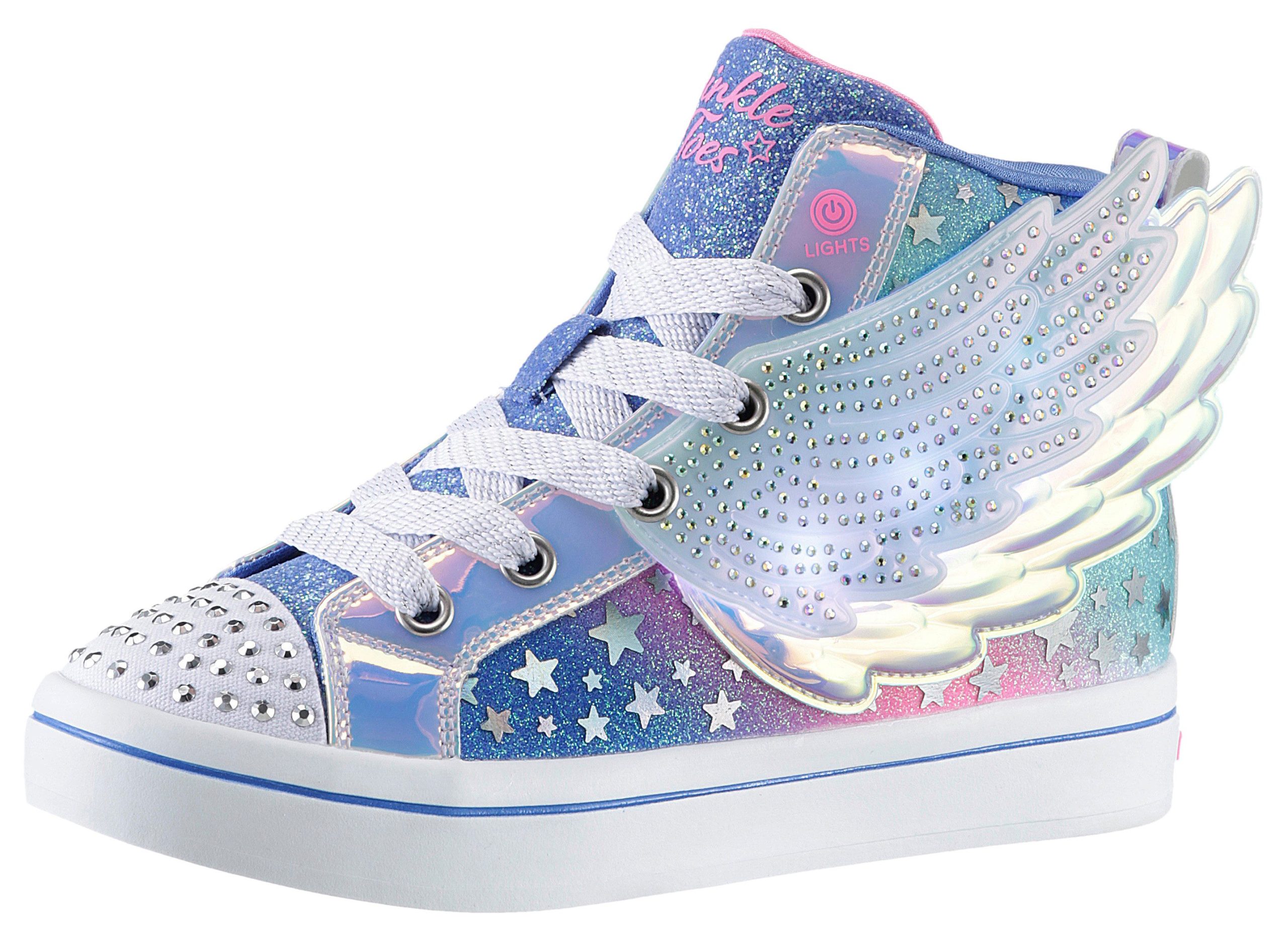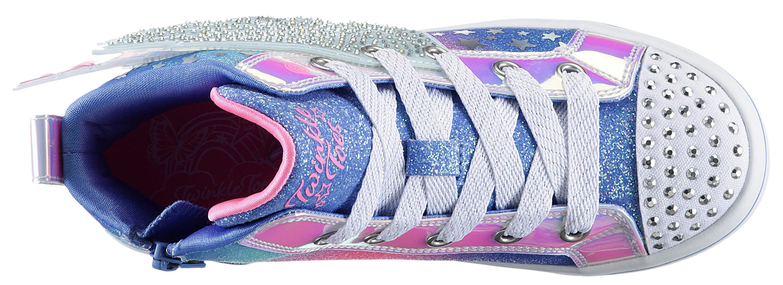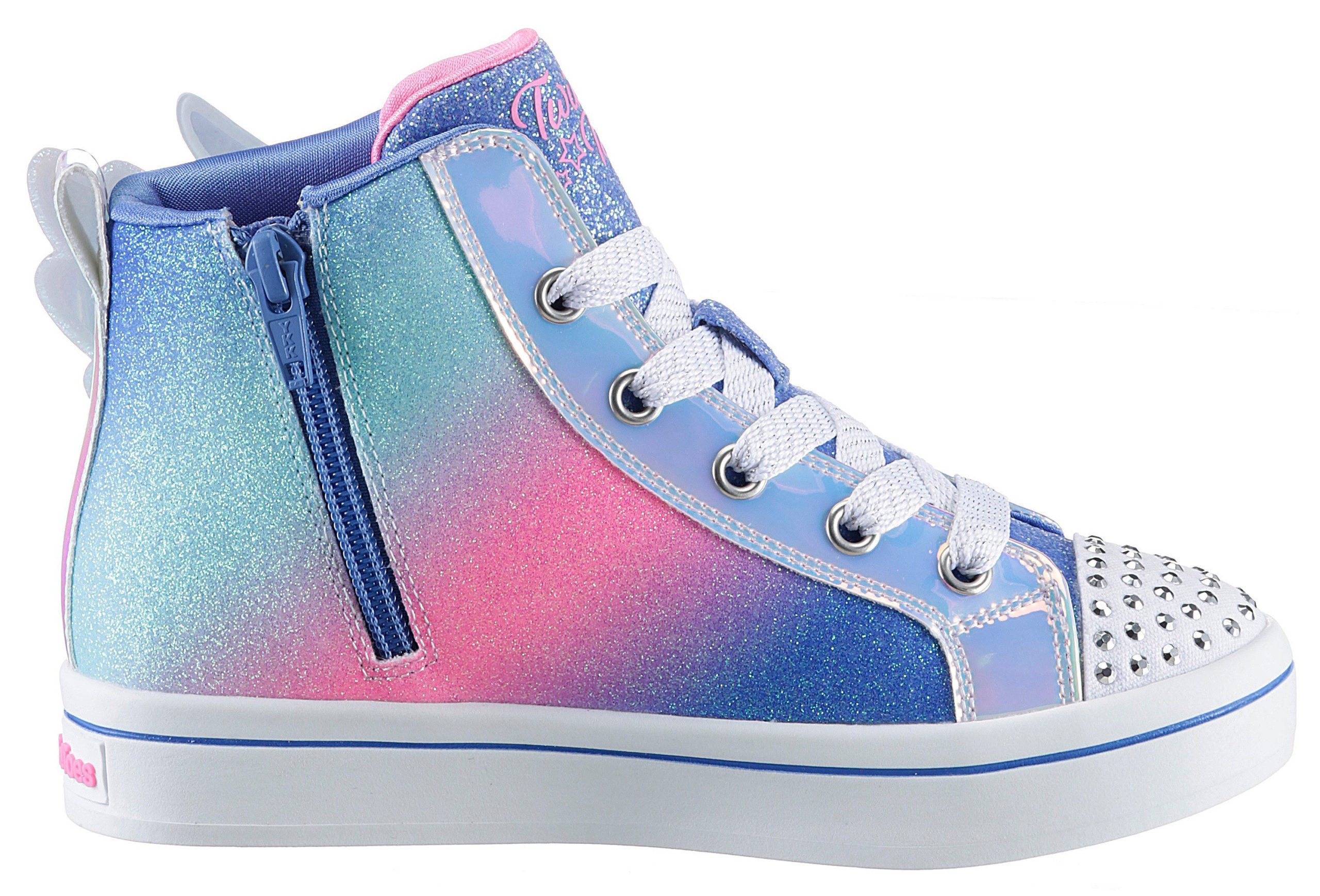 Description: Stilvollen Glanz und magischen Spaß gibt’s in den Skechers Twiinkle Toes®: Twi-Lites 2.0 – Dreamy Wings. Dieser knöchelhohe Schnürsneaker mit Leuchteffekt verfügt über ein Obermaterial aus Synthetik mit Glitzer-Finish und Flügel-Detail, einen Reißverschluss in der Mitte, eine gepolsterte Komfort-Innensehle und eine mit Strasssteinen verzierte Zehenkappe.