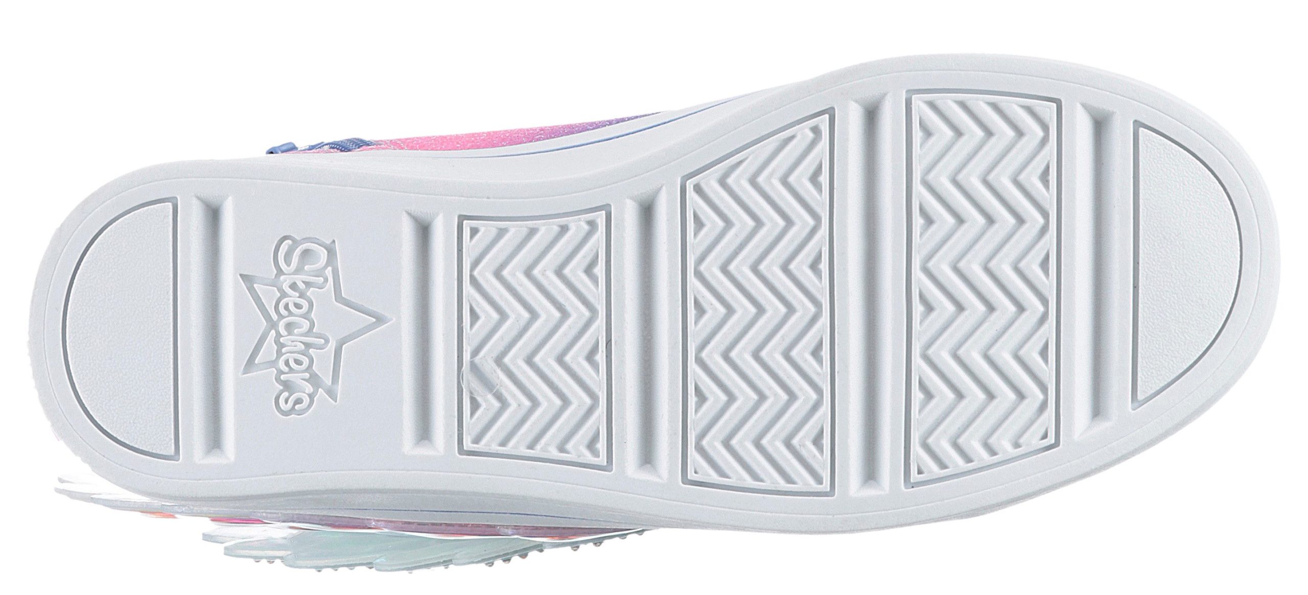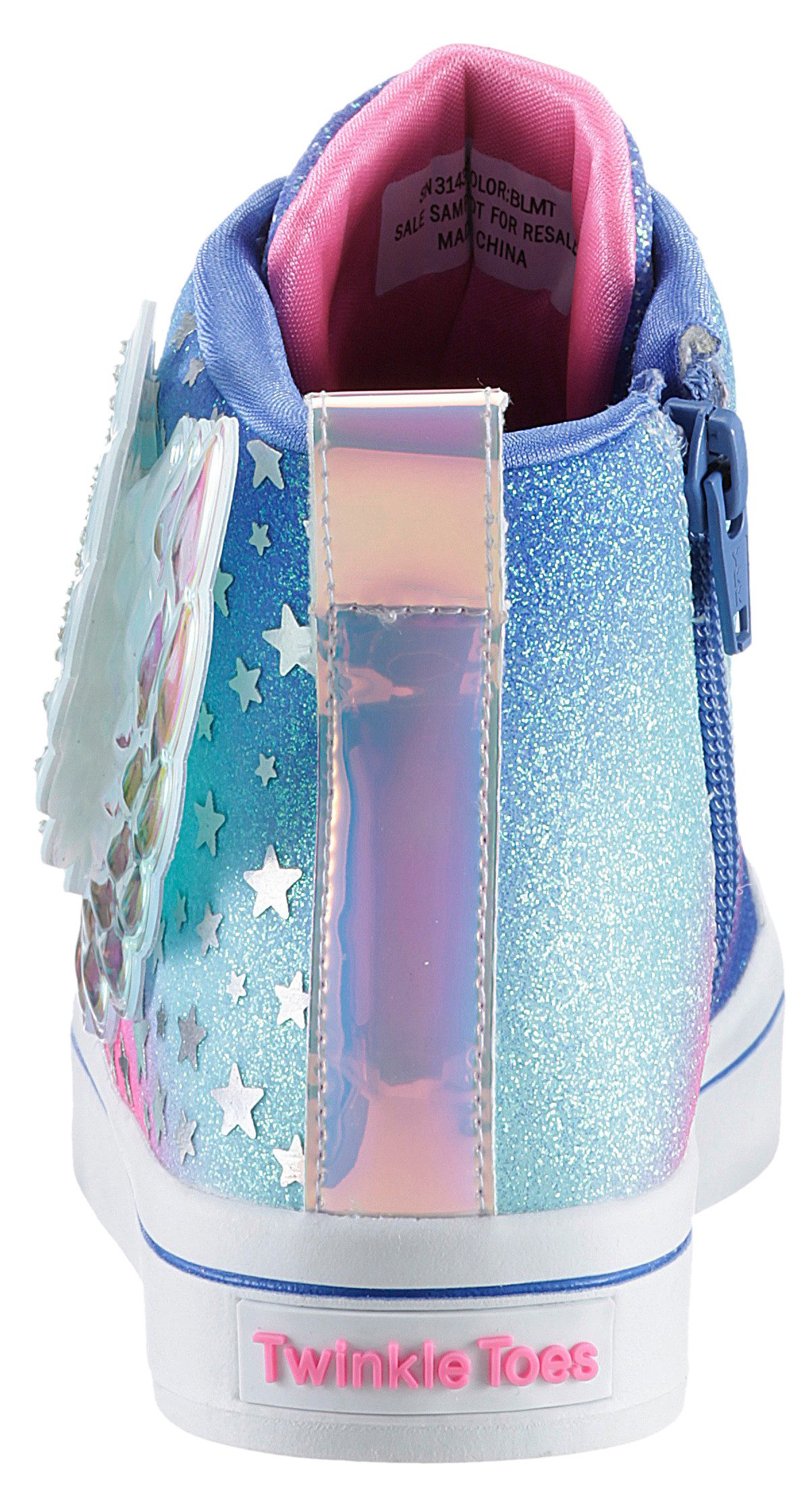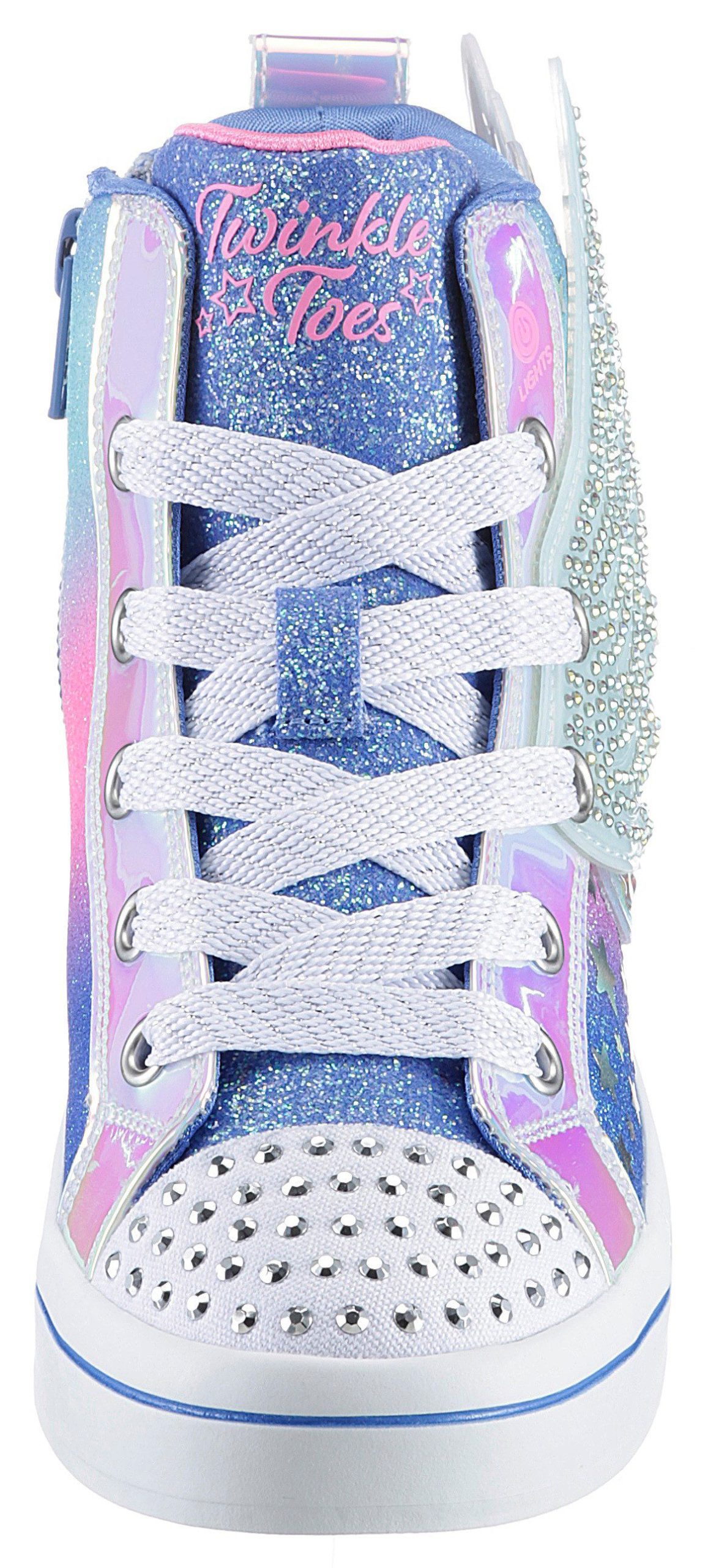Description: Stilvollen Glanz und magischen Spaß gibt’s in den Skechers Twiinkle Toes®: Twi-Lites 2.0 – Dreamy Wings. Dieser knöchelhohe Schnürsneaker mit Leuchteffekt verfügt über ein Obermaterial aus Synthetik mit Glitzer-Finish und Flügel-Detail, einen Reißverschluss in der Mitte, eine gepolsterte Komfort-Innensehle und eine mit Strasssteinen verzierte Zehenkappe.