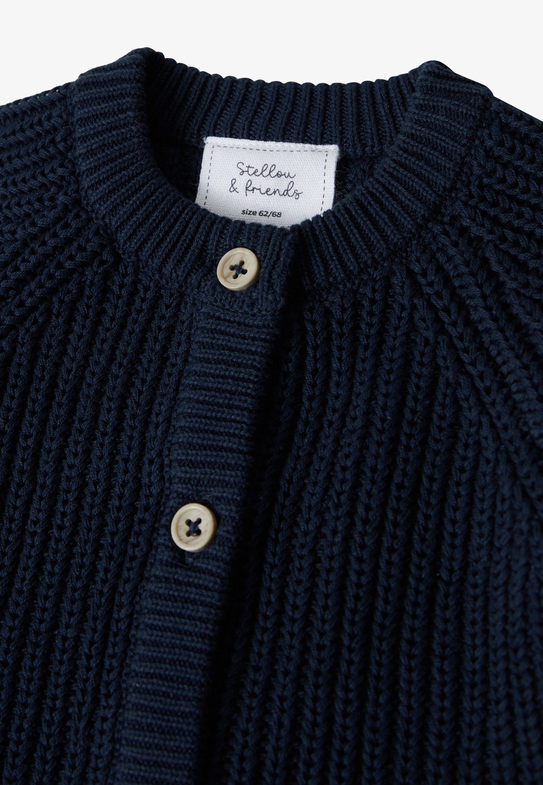 Stellou & Friends – Only the best for your little ones! This cardigan is knitted in a decorative texture that creates a natural look. The 100% cotton fabric has a soft feel. The elegant design is complemented by wooden-look buttons and raglan sleeves with cuffs.