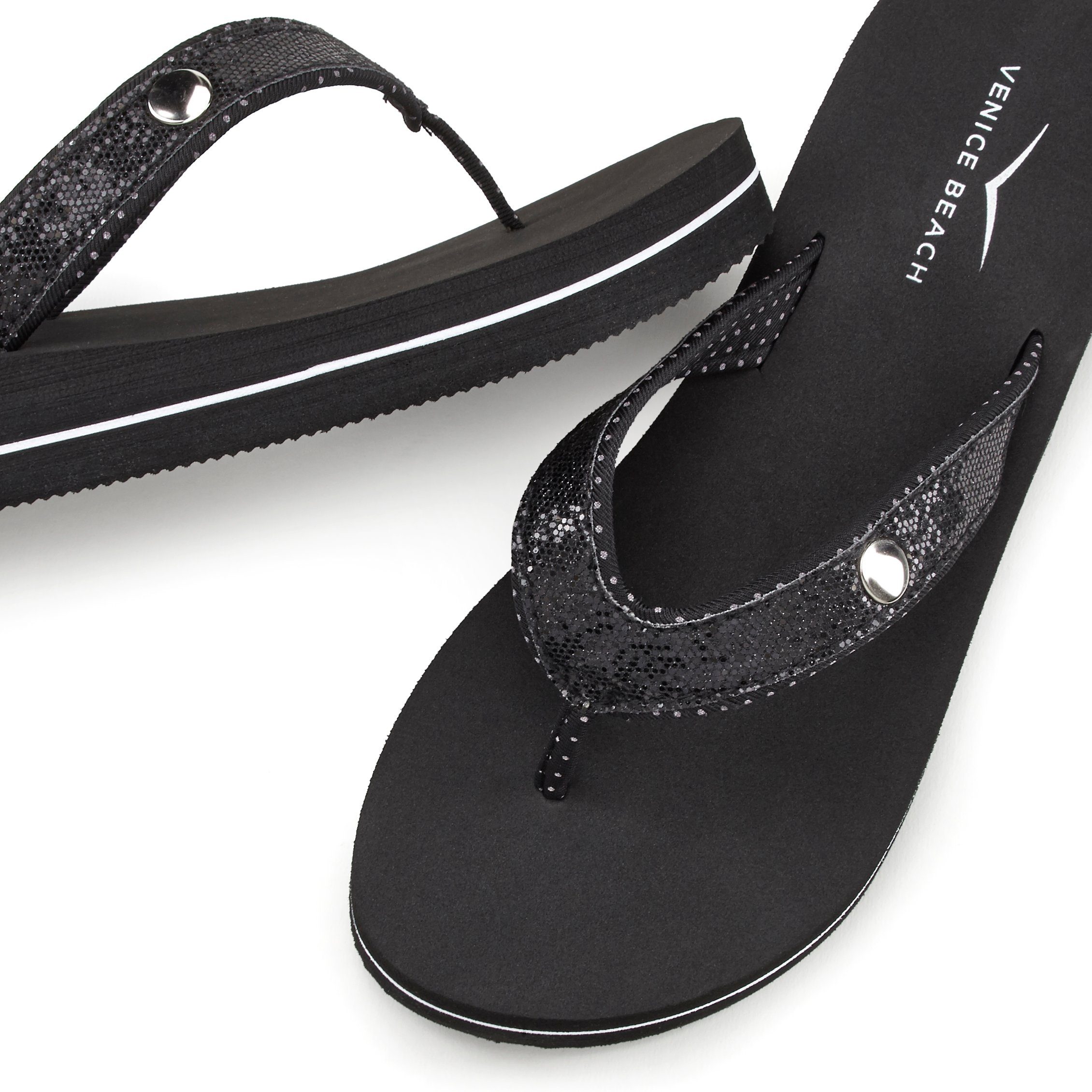 Venice Beach Badezehentrenner – die klassischen Zehentrenner mit leichtem Absatz, angenehmem Glitzereffekt, leicht profilerter Sohle und wasserabweisender Materialbeschaffenheit für Strand und Pool.