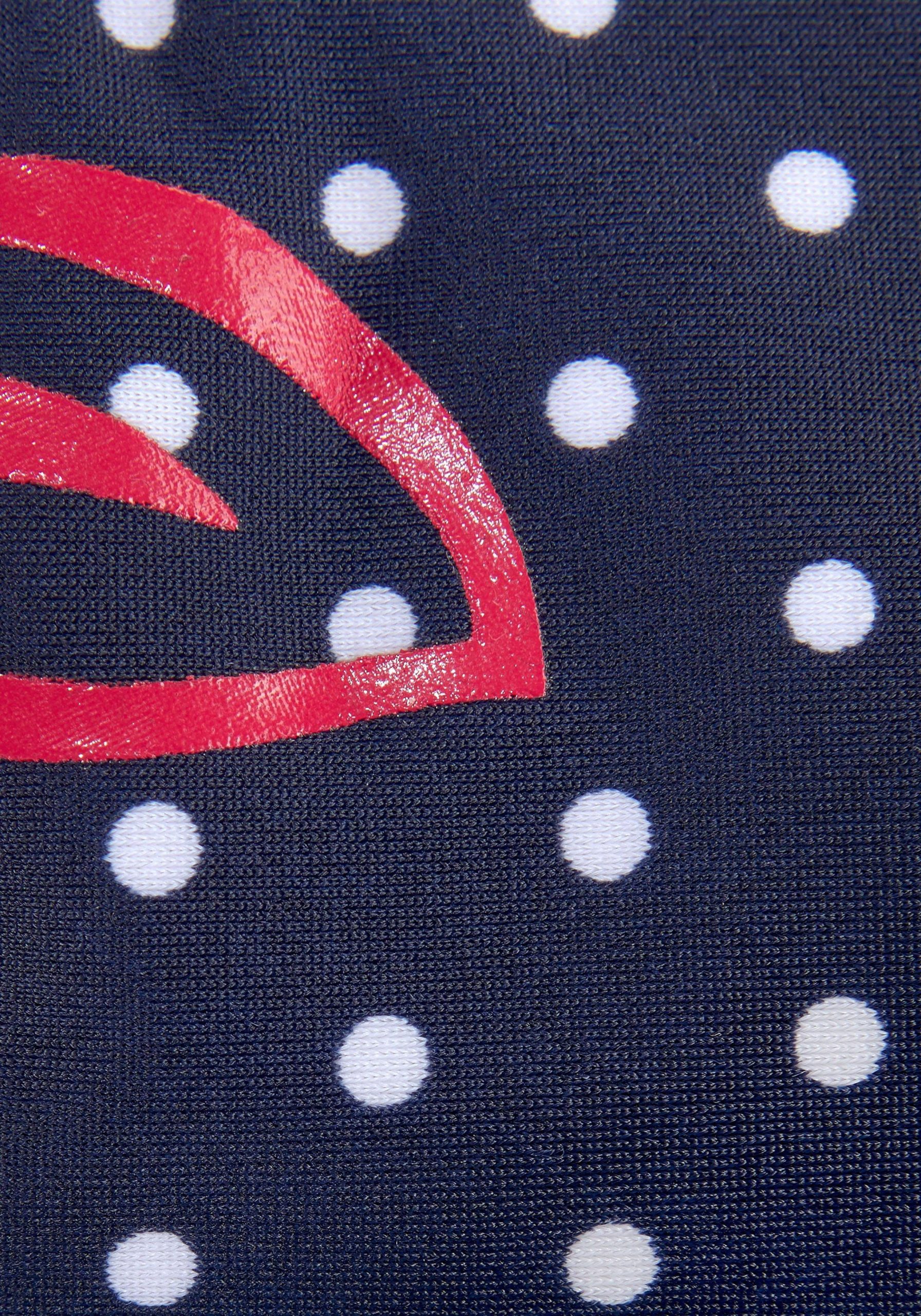 Punkt, Punkt, Komma, Strich – absolut fröhlich gibt sich der Triangel-Bikini von Venice Beach. Nicht nur das süße Tupfenmuster, auch die Blumenprints sorgen für den verspielten Look des Zweiteilers, der von den Raffungen und Schleifen an den Seiten des Höschens noch unterstrichen wird. Ein kleines Emblem am Bund rundet das Design ab. Praktisch: Das Oberteil lässt sich per Clipverschluss im Rücken schließen, die Neckholder-Träger kannst du unkompliziert verstellen. Das Futter vorn im Bikini trägt ebenso zum Komfort bei wie das elastische Material. Volle Punktzahl für den Triangel-Bikini von Venice Beach!